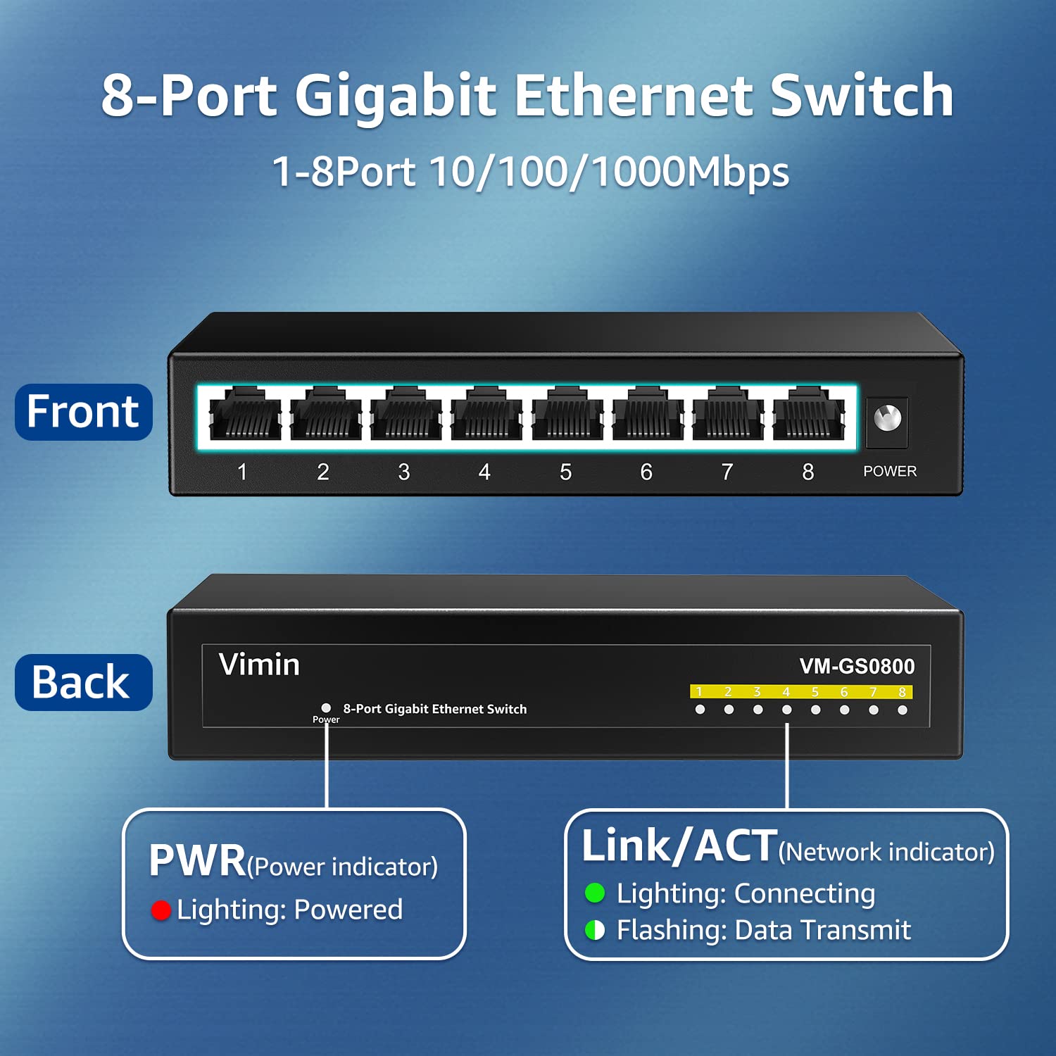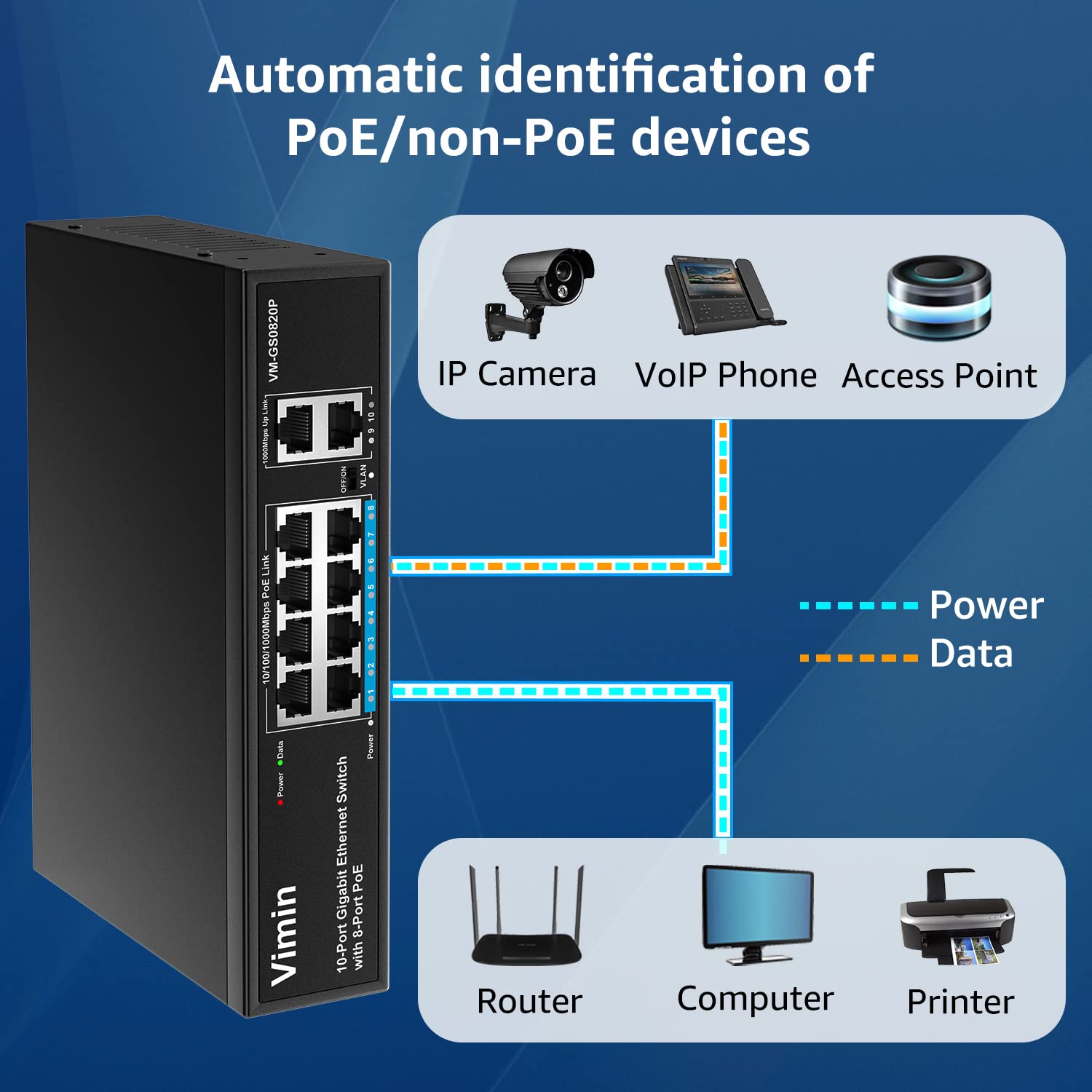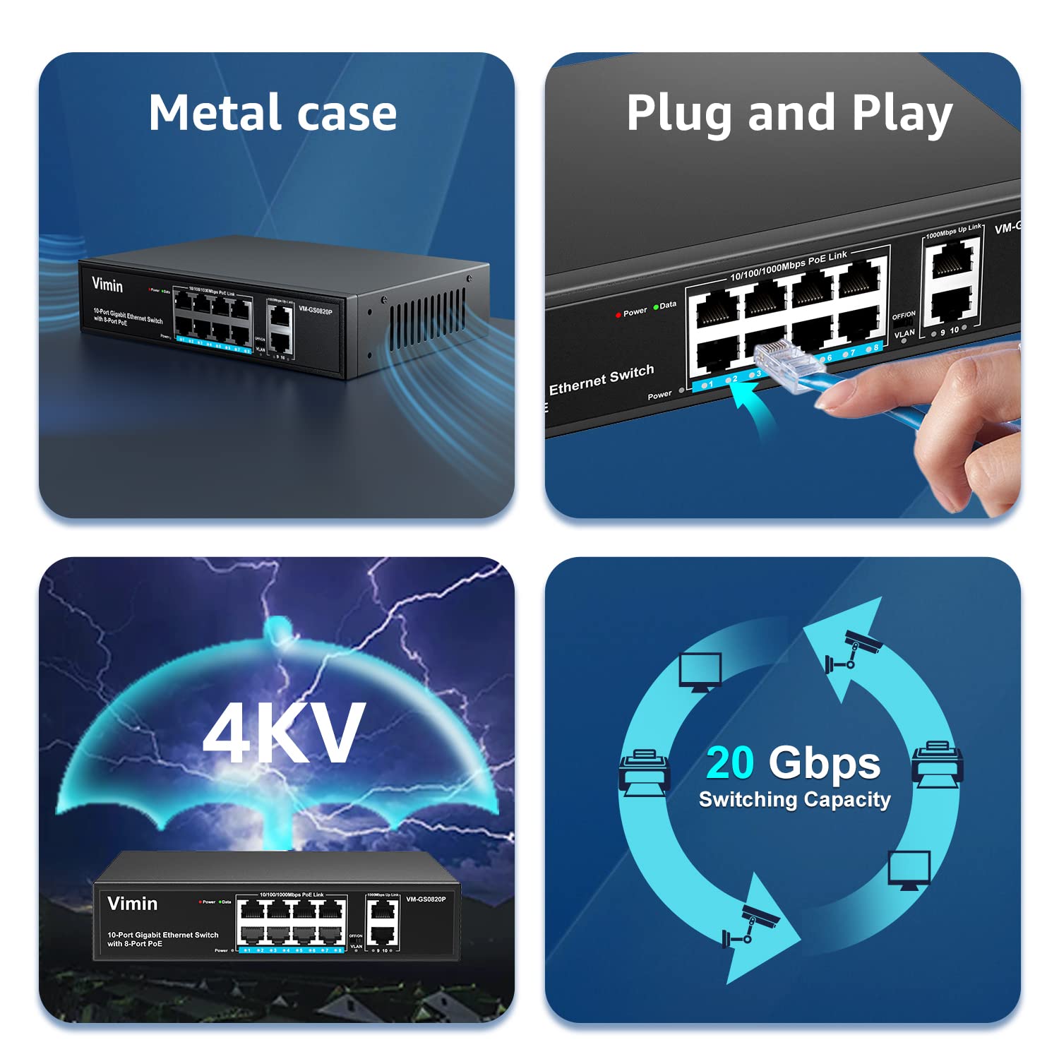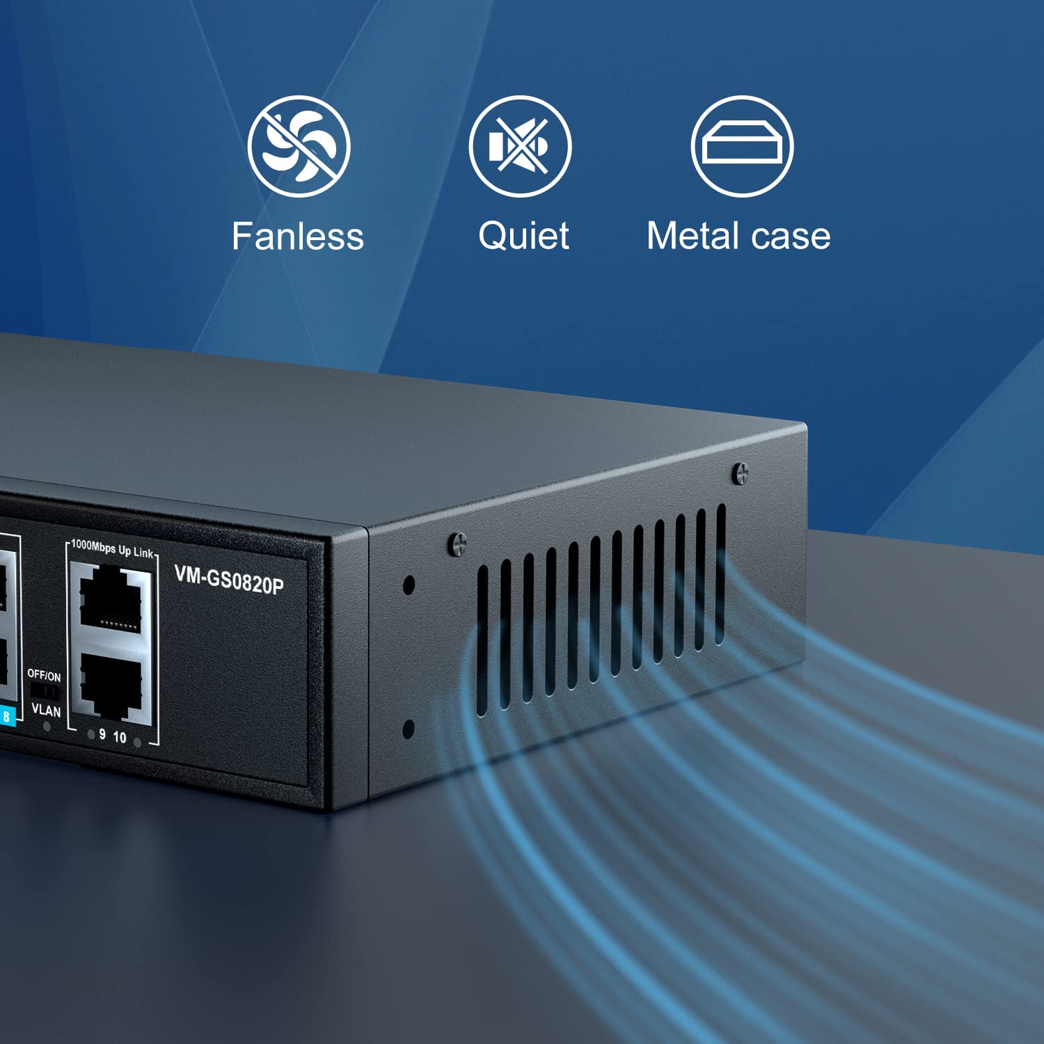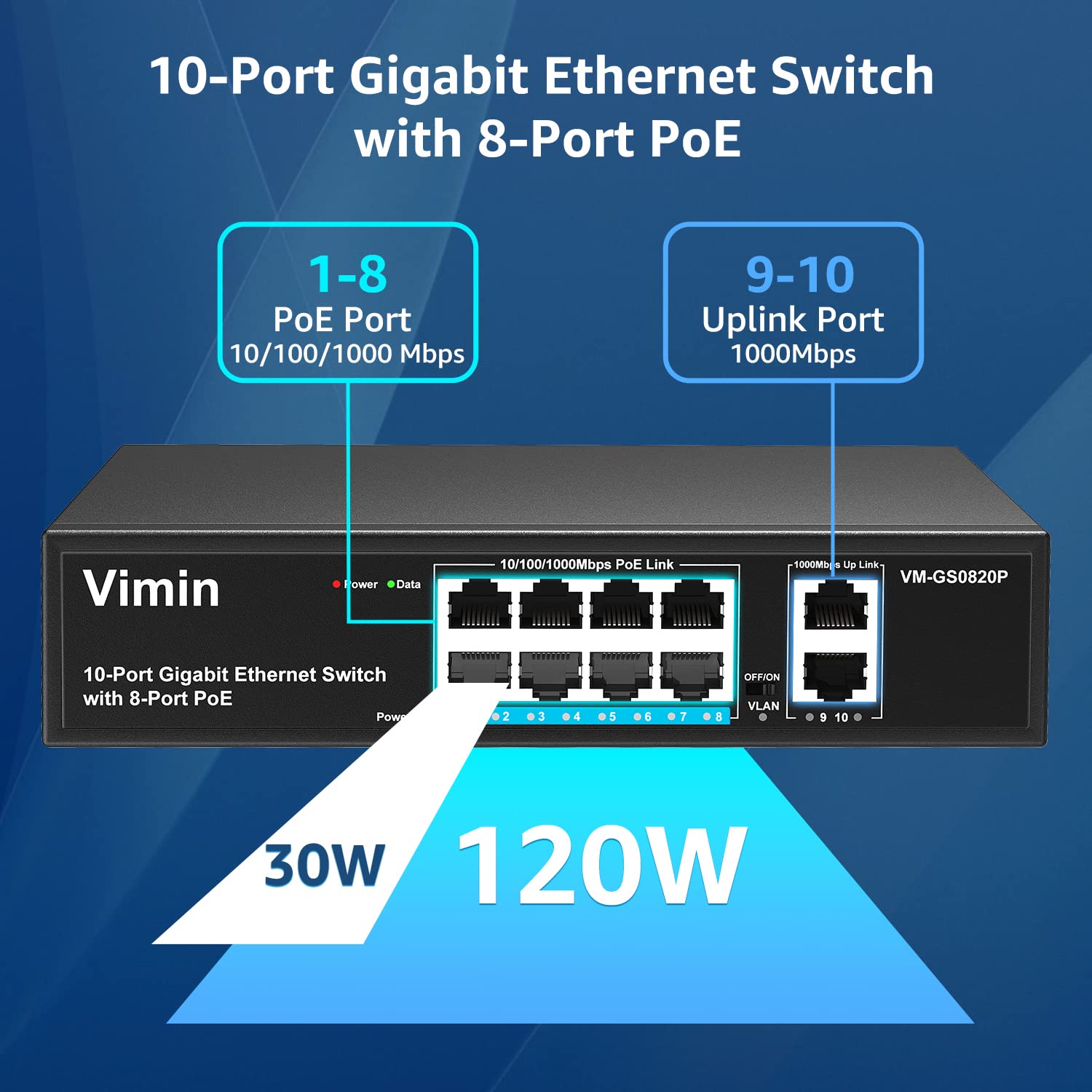 VIMIN 8 Port Gigabit PoE Switch Unmanaged with 2 Uplink Gigabit Ports, 120W High Power, Support IEEE802.3af/at,Vlan 10 Port Network Power Over Ethernet Switch.