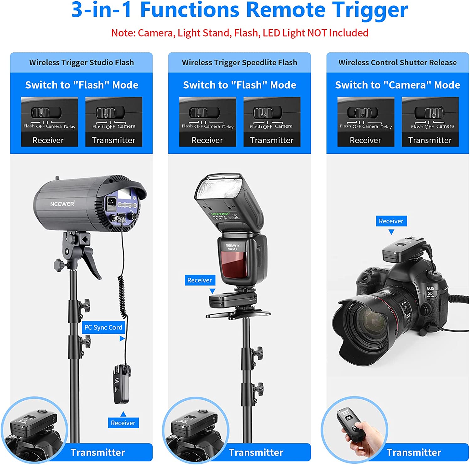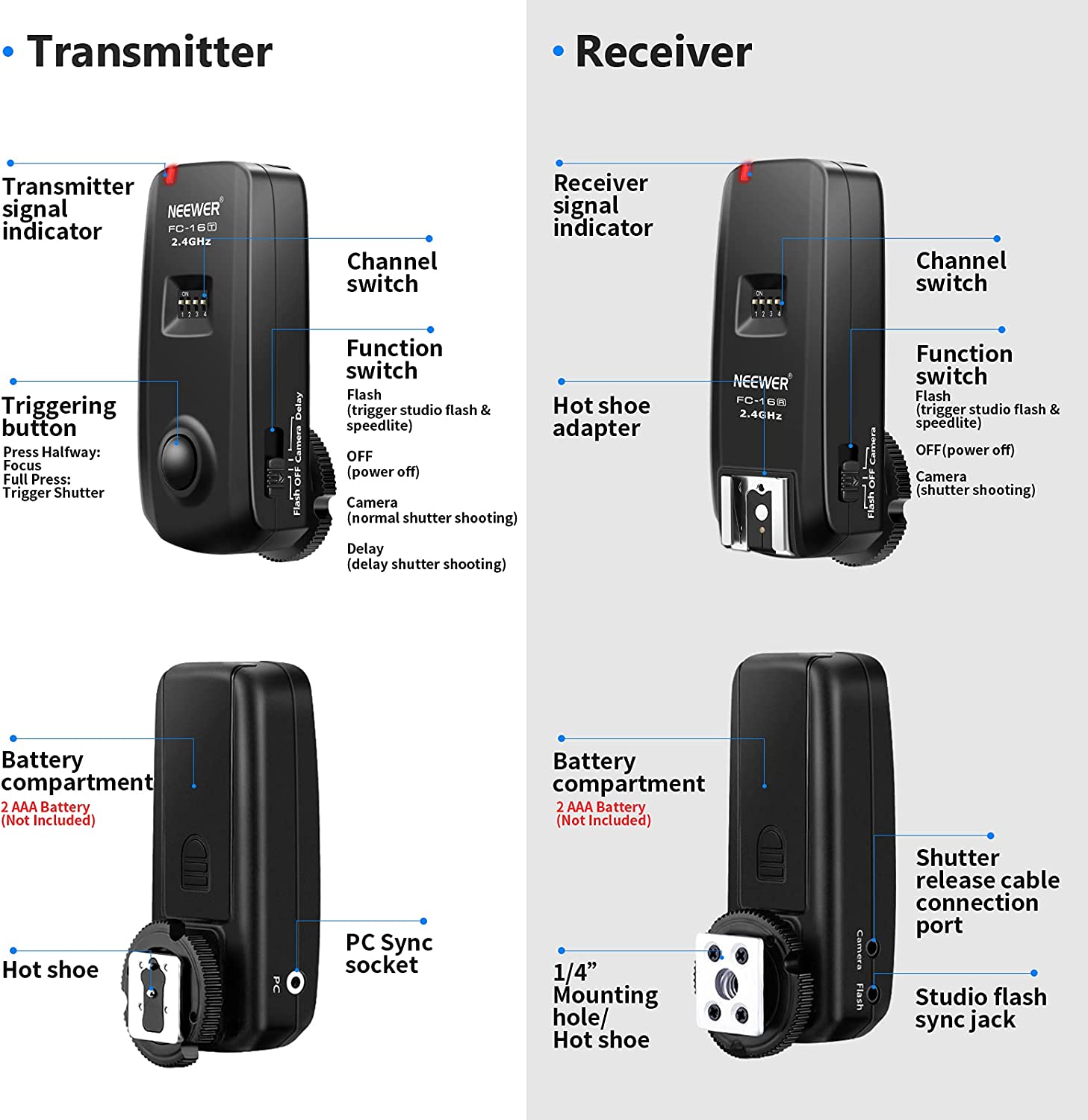 - The Neewer Photo wireless flash trigger receiver and transmitter can serve you in a multitude of functions.