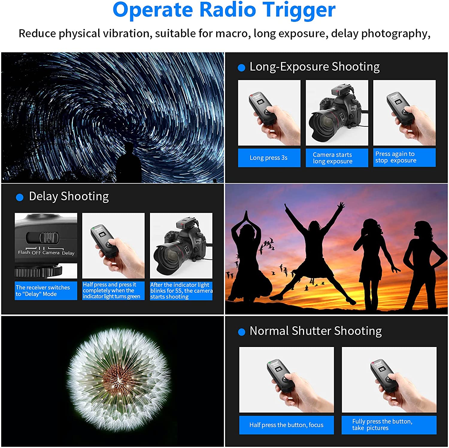 - Finally, if you wish to use this pack for wireless flash / studio flash triggering purposes, first attach the transmitter to your camera's hot shoe mount. Attach your flash to the hot shoe mount of the receiver and make sure the switches are set to ""FLASH"" mode and you can proceed to position the flash however you desire and take photos normally.