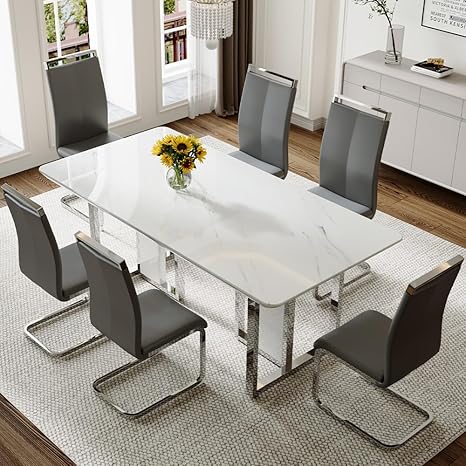 67" White Dining Table Set 6, 7 Pieces White Glossy Kitchen Table Set 6 with Grey Chairs, Modern Dining Table Set 6 for Home Kitchen, Luxury Dining Table Set 6