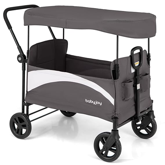 BABY JOY Collapsible Wagon Stroller for 2 Kids & Cargo, Push Pull Double Stroller w/Adjustable Handle Bar, Removable Canopy, Safety Harness, All Terrain Wheels, Foot Brake, Storage Pockets (Gray)