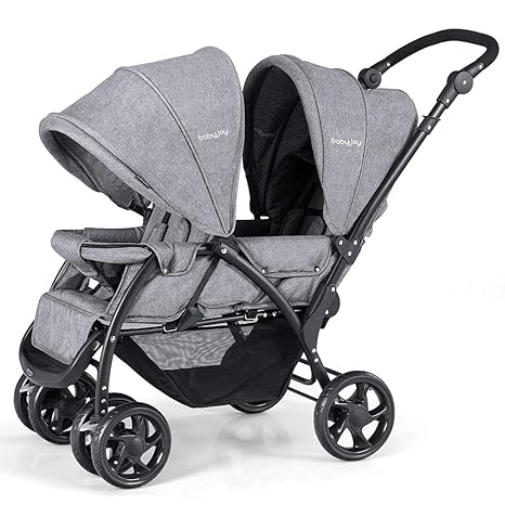 BABY JOY Double Stroller, Foldable Lightweight Twin Stroller with Tandem Seating, Adjustable Backrest/Canopy/Footrest, 5-Point Harness, Storage Basket, Double Stroller Newborn and Toddler (Gray)