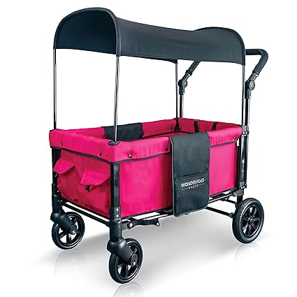 WONDERFOLD W1 Original Stroller Wagon (2 Seater) - Collapsible Wagon Stroller with Seats with 5-Point Harnesses, Adjustable Push Handle, and Sun Canopy, Fuscia Pink