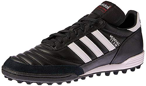 Details: Product Description Classic styling offers a softly-lined shoe with an extended tongue, no-chafe heel counter and a wedge outsole with molded studs. Amazon.com Keep your footing on turf and hard surfaces with the Mundial Team soccer shoe from adidas. Soft leather delivers responsive feel while the fine-grained stud pattern digs in stubbornly on hard surfaces. Lightweight and cushioned, this is a shoe to take your game to the next level. From the Manufacturer adidas is a name that stands for excellence in all sectors of sport around the globe. The vision of company founder Adolf Dassler has become a reality, and his corporate philosophy has been the guiding principle for successor generations. The idea was as simple as it was brilliant: to provide every athlete with the best possible equipment. It all began in 1920, when Adi Dassler made his first shoes using the few materials available after the First World War. Today, the adidas product range extends from shoes, apparel, and accessories for basketball, soccer, fitness and training to adventure, trail and golf.