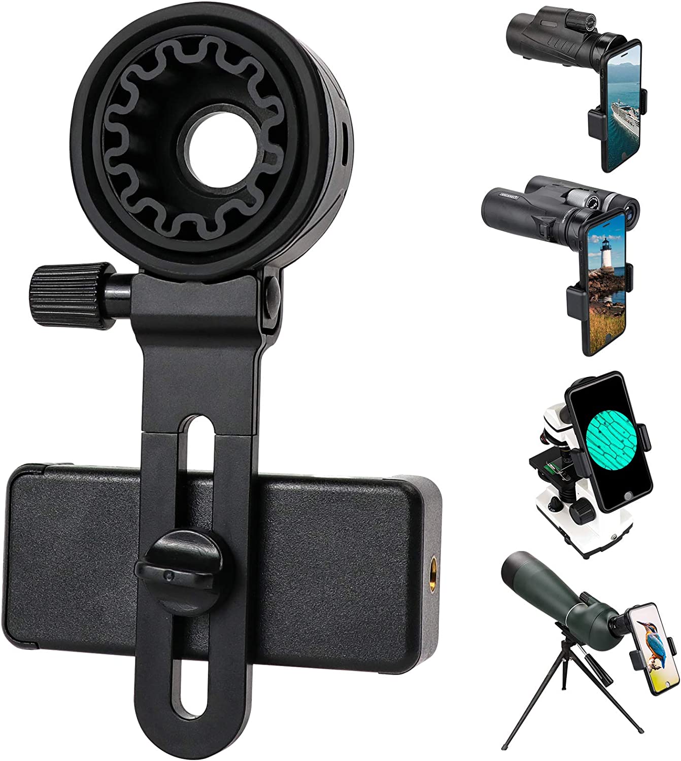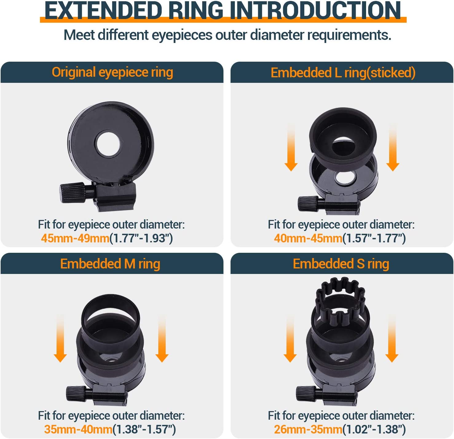 • 【Fits Wide Range of Eyepieces】The universal phone adapter mount(with 3 additional rubber rings) is suitable for eyepieces with 28mm-49mm(1.10”-1.93”) outer diameter and can be mounted almost of binoculars, monocular, telescopes, spotting scopes, Microscopes.