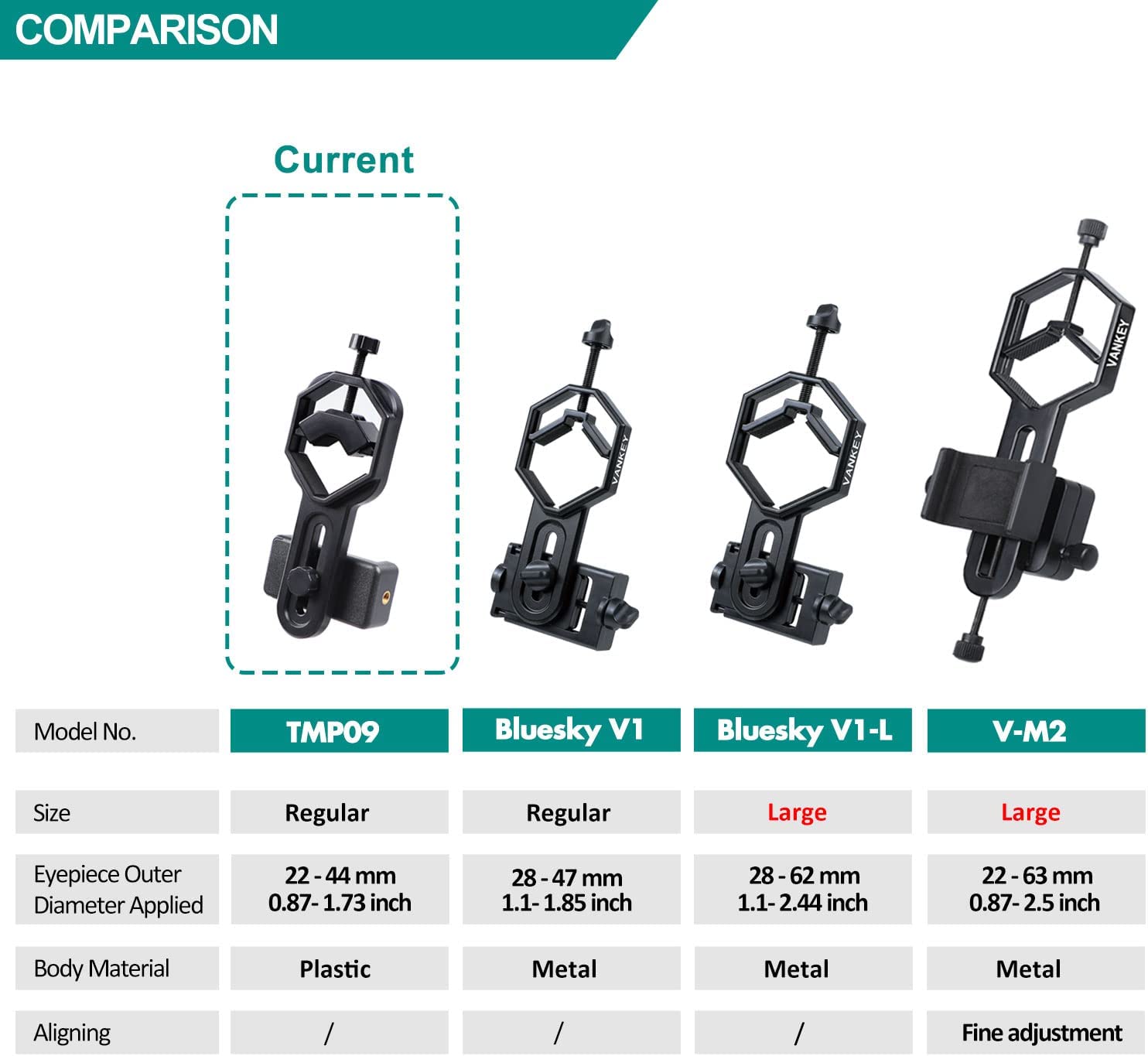 • 【Applicable Eyepiece Range】ONLY fits the outer diameter range of the eyepiece is 22-44 mm / 0.87-1.73 inch. For the microscope, astronomical telescope, binoculars, monocular, it works with the most models. For the spotting scopes, only works with few models, not for Vortex Razor / Viper / Diamondback, Kowa TSN, Leupold SX etc, so please measure the outer diameter of your eyepiece before ordering. (or choose the big version Bluesky V1-L,V-M2)