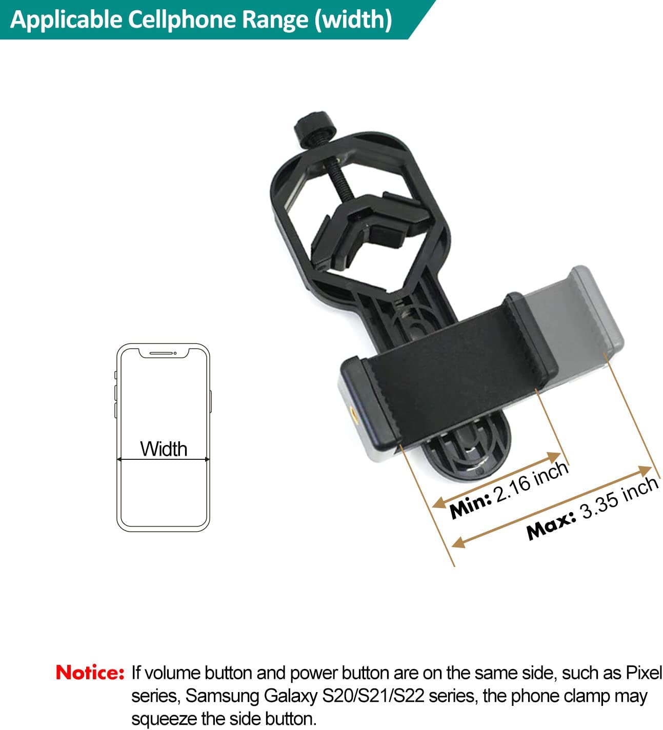 • 【Applicble Phone Width Range】Fits the phone width range is 55-85 mm / 2.16-3.35 inch, such as iPhone, Samsung etc. May NOT properly fit Pixel series, Samsung Galaxy S20/S21/S22 series, because the volume and power button on these phones are on the same side, which may cause the phone clamp wing to squeeze the side button. If your phone with armored case or bulky case, remove it to ensure the phone fits in the phone clamp well.