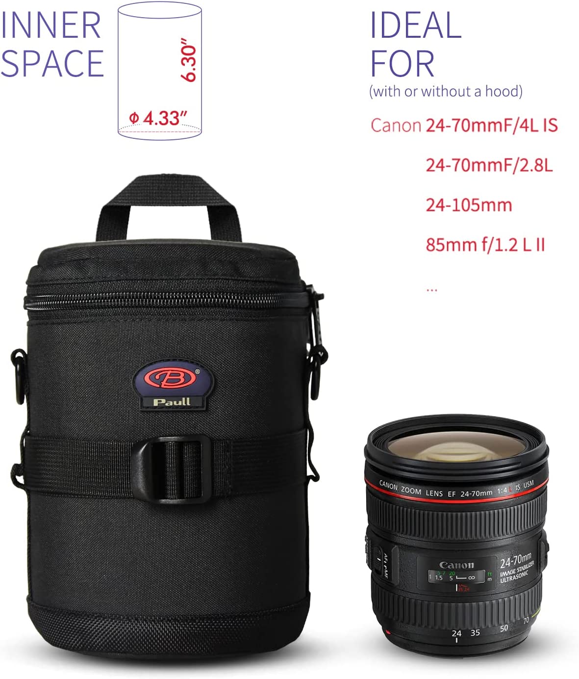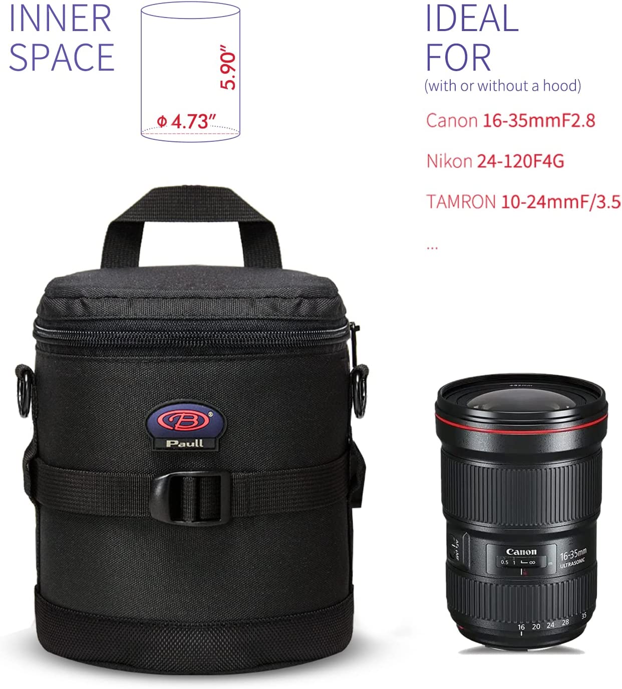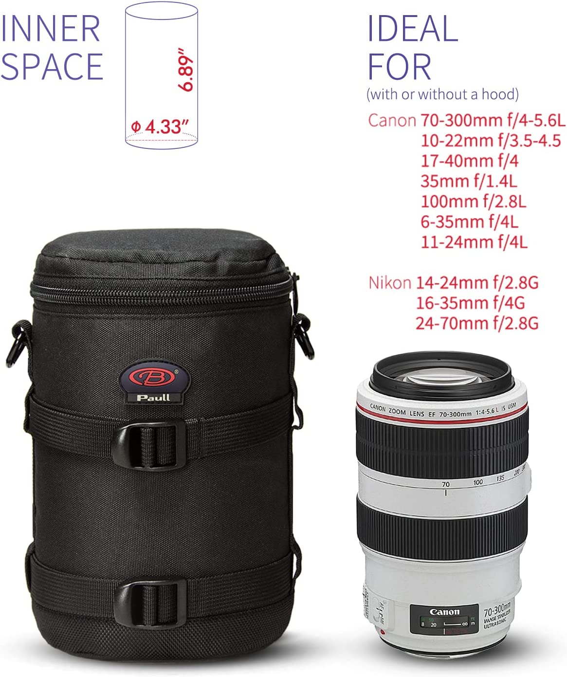 • Dimension--Inner size: 4.33 x 6.89 inch of the diameter and height. Compatible with Canon 70-300mm f/4-5.6L, 10-22mm f/3.5-4.5, 17-40mm f/4, 35mm f/1.4L, 100mm f/2.8L, 6-35mm f/4L, 11-24mm f/4L, Nikon 14-24mm f/2.8G, 16-35mm f/4G, 24-70mm f/2.8G