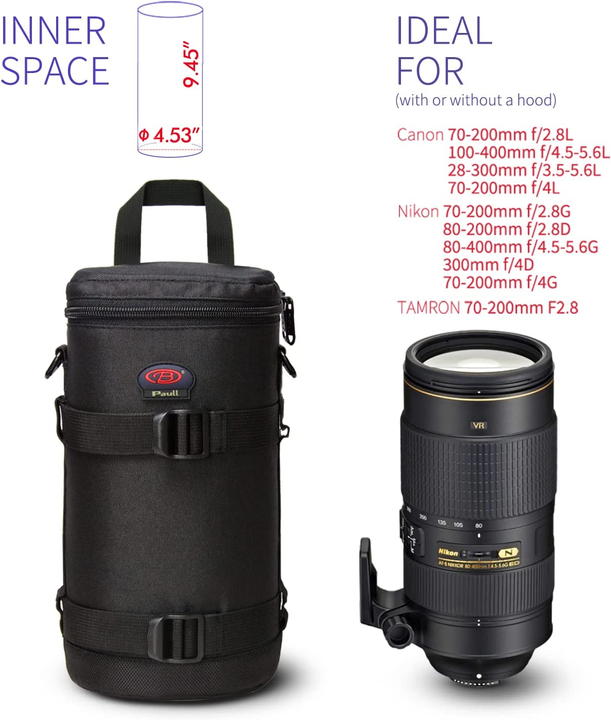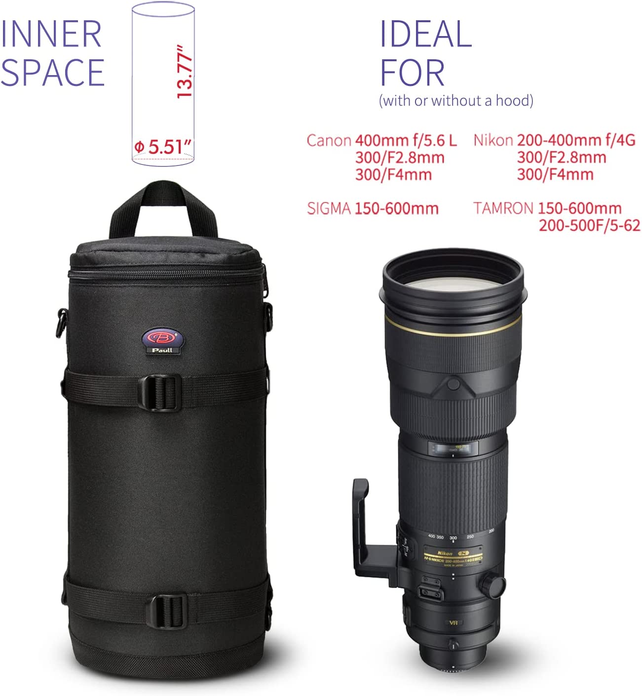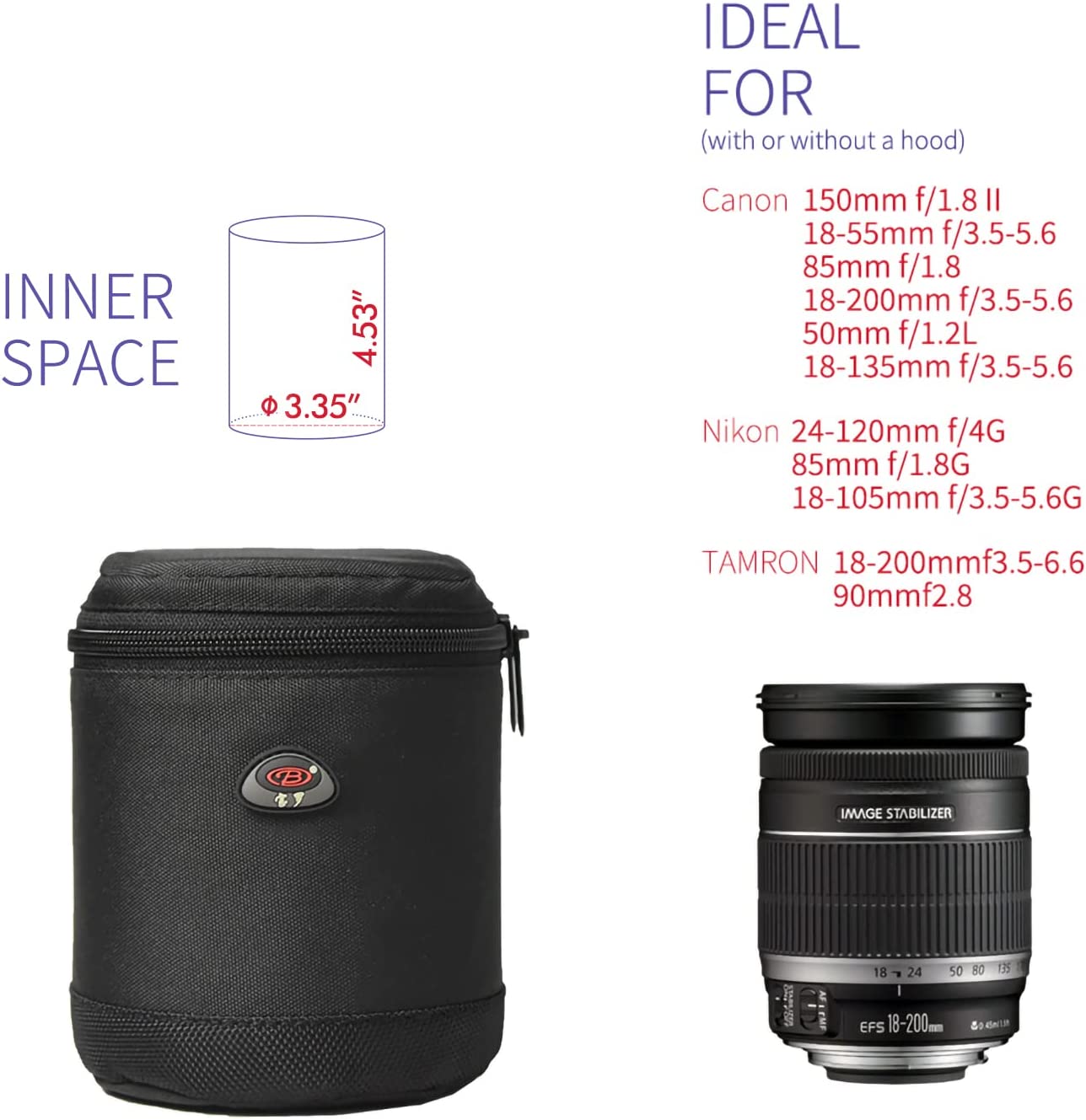 • Dimension--Inner size: 4.33 x 6.89 inch of the diameter and height. Compatible with Canon 70-300mm f/4-5.6L, 10-22mm f/3.5-4.5, 17-40mm f/4, 35mm f/1.4L, 100mm f/2.8L, 6-35mm f/4L, 11-24mm f/4L, Nikon 14-24mm f/2.8G, 16-35mm f/4G, 24-70mm f/2.8G