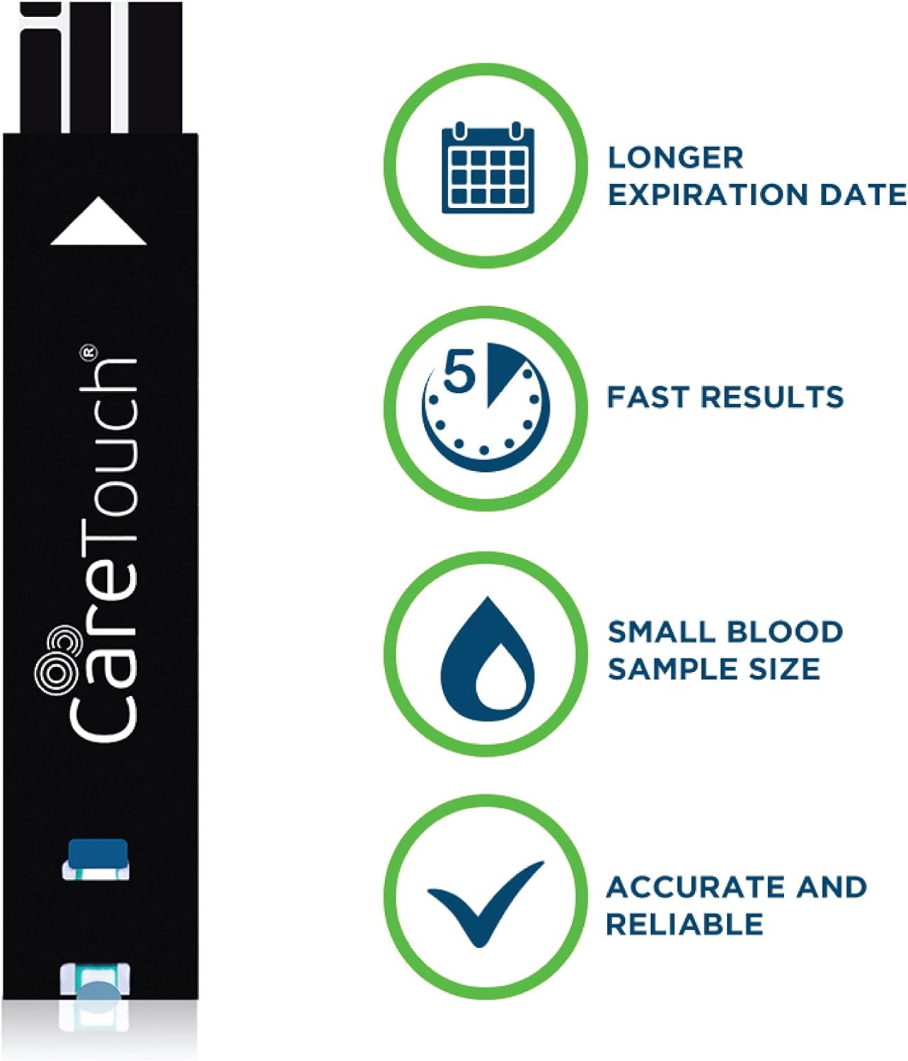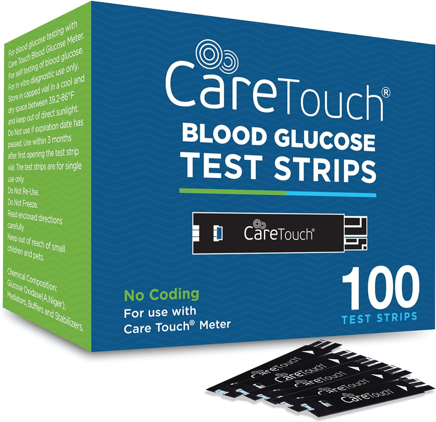 • PACKAGING MAY VARY - Care Touch Blood Glucose Test Strips (100 Count) for Use with Care Touch Monitor (2 boxes of 50). These diabetic supplies are compatible with our glucose monitor kit, providing you with everything you need for accurate blood sugar testing, and other Care Touch products such as Care Touch lancets for your convenience.