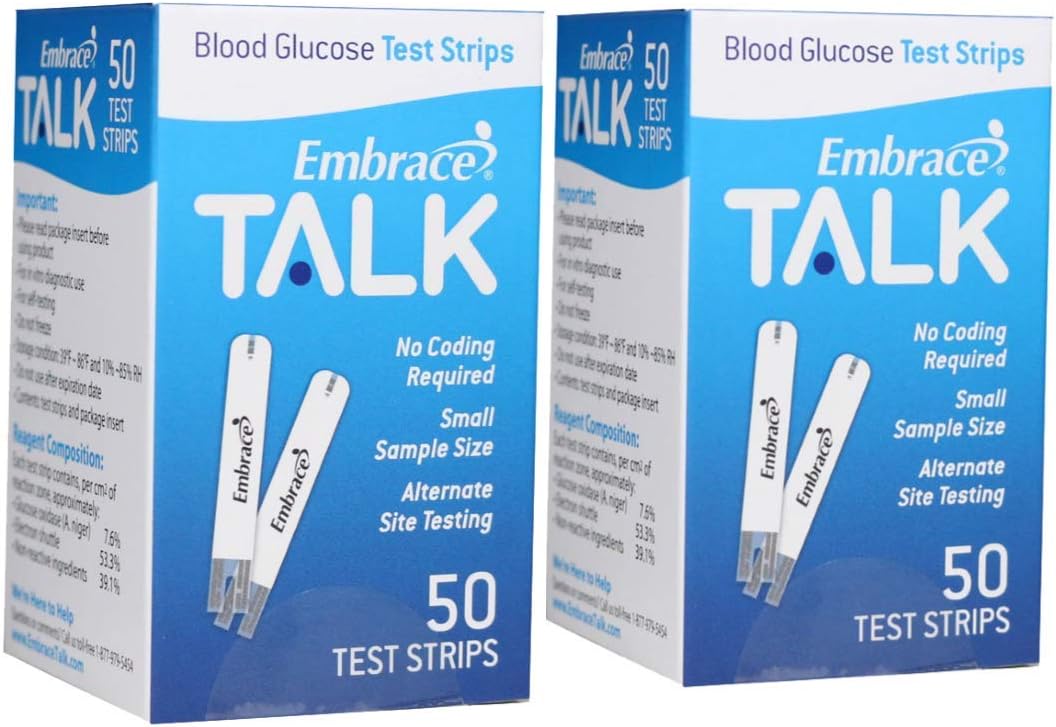 Embrace Test Strips ensure accurate results with Embrace meters using an instant three-step verification system: 1. Sensors determine if test strip is inserted correctly. 2. Pinpoint technology detects the sample. 3. Fill detection verifies whether the sample size is adequate for testing. This listing includes two boxes of 50 strips each (100 strips total).