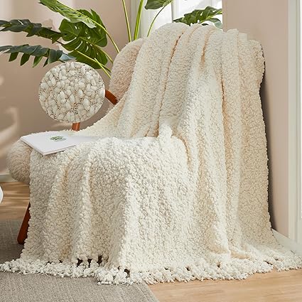 Am�©lie Home Summer Throw Blanket Chunky Soft Fluffy Knit Throw Blankets Textured Mulberry Throw Blanket with Handmade Tassels Woven Luxury Farmhouse Throws for Couch Sofa Bed (Ivory, 50 x 60)
