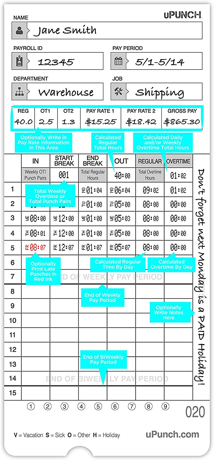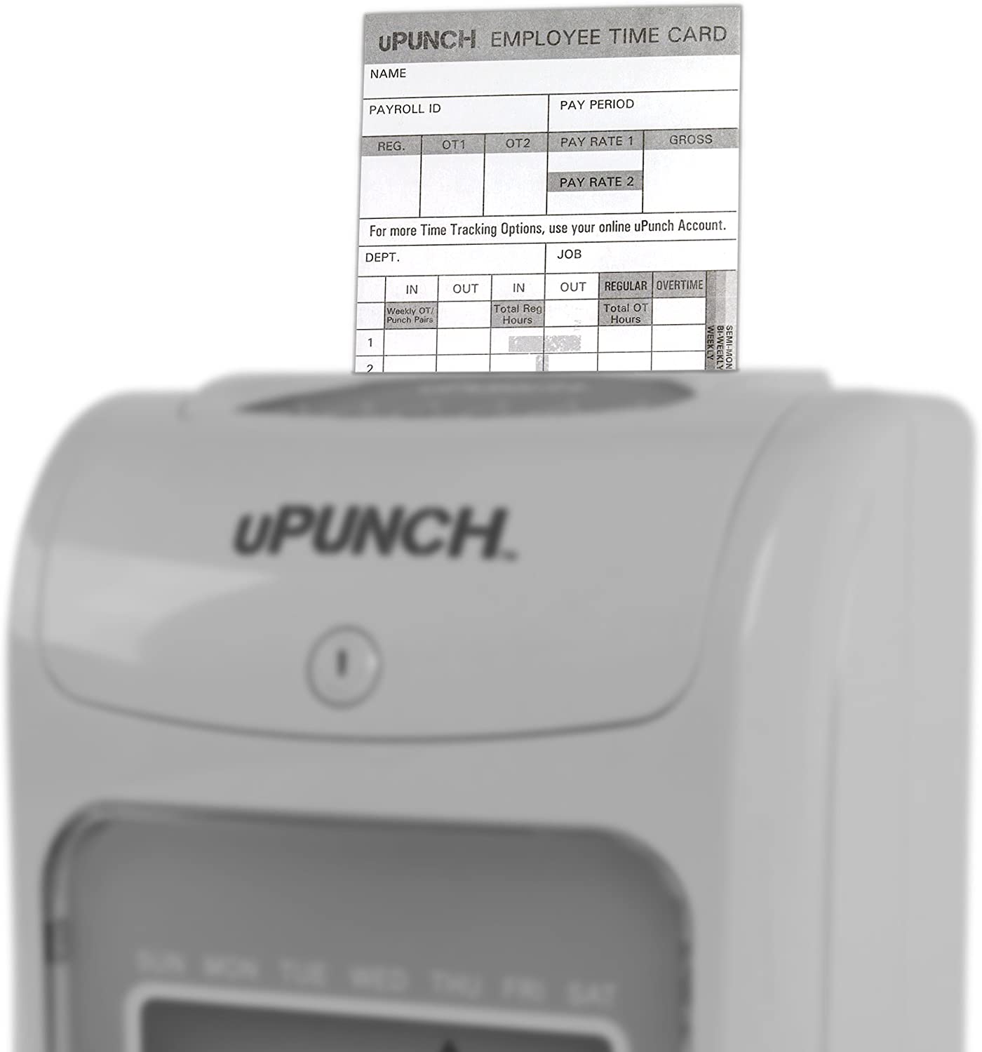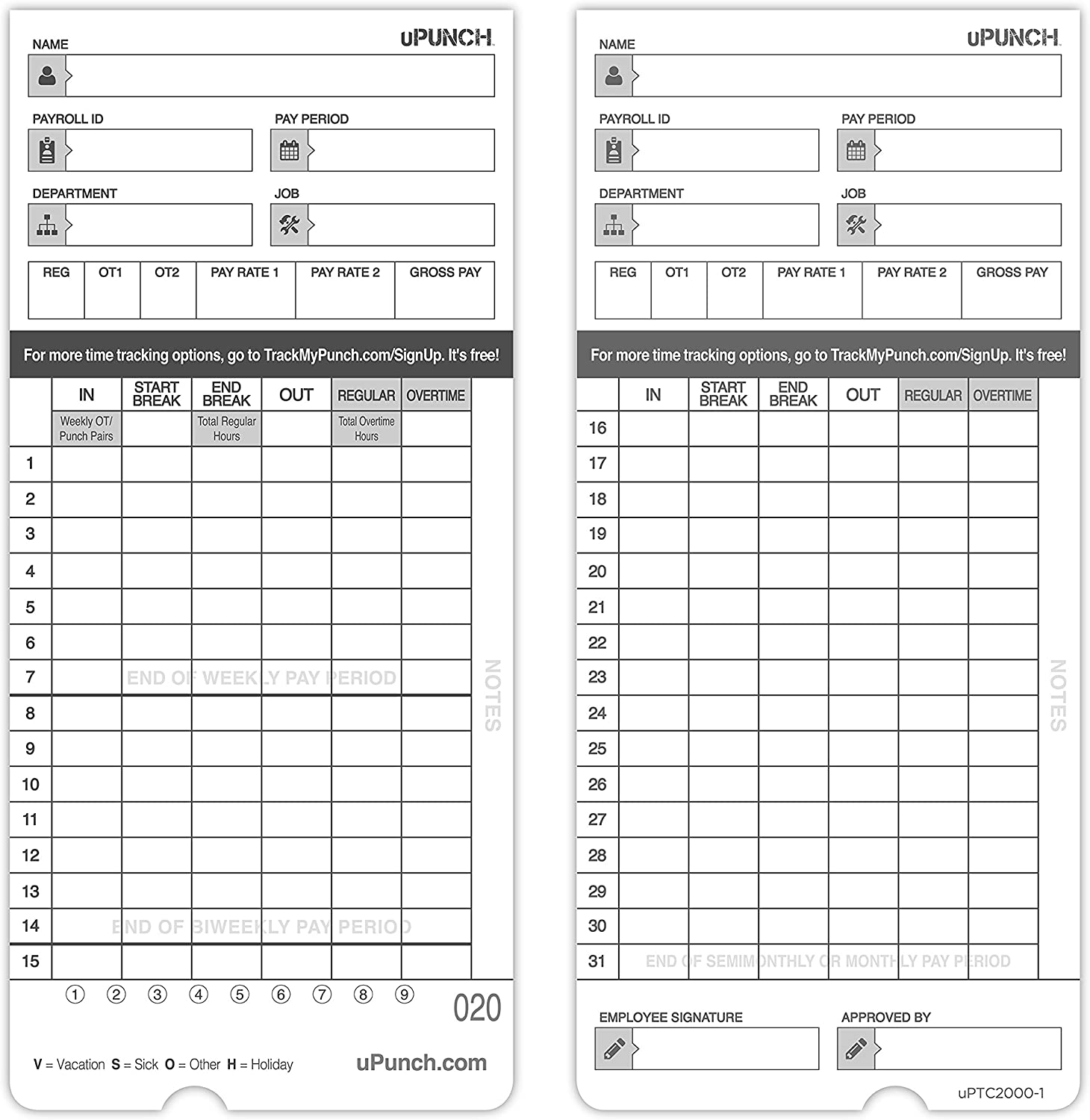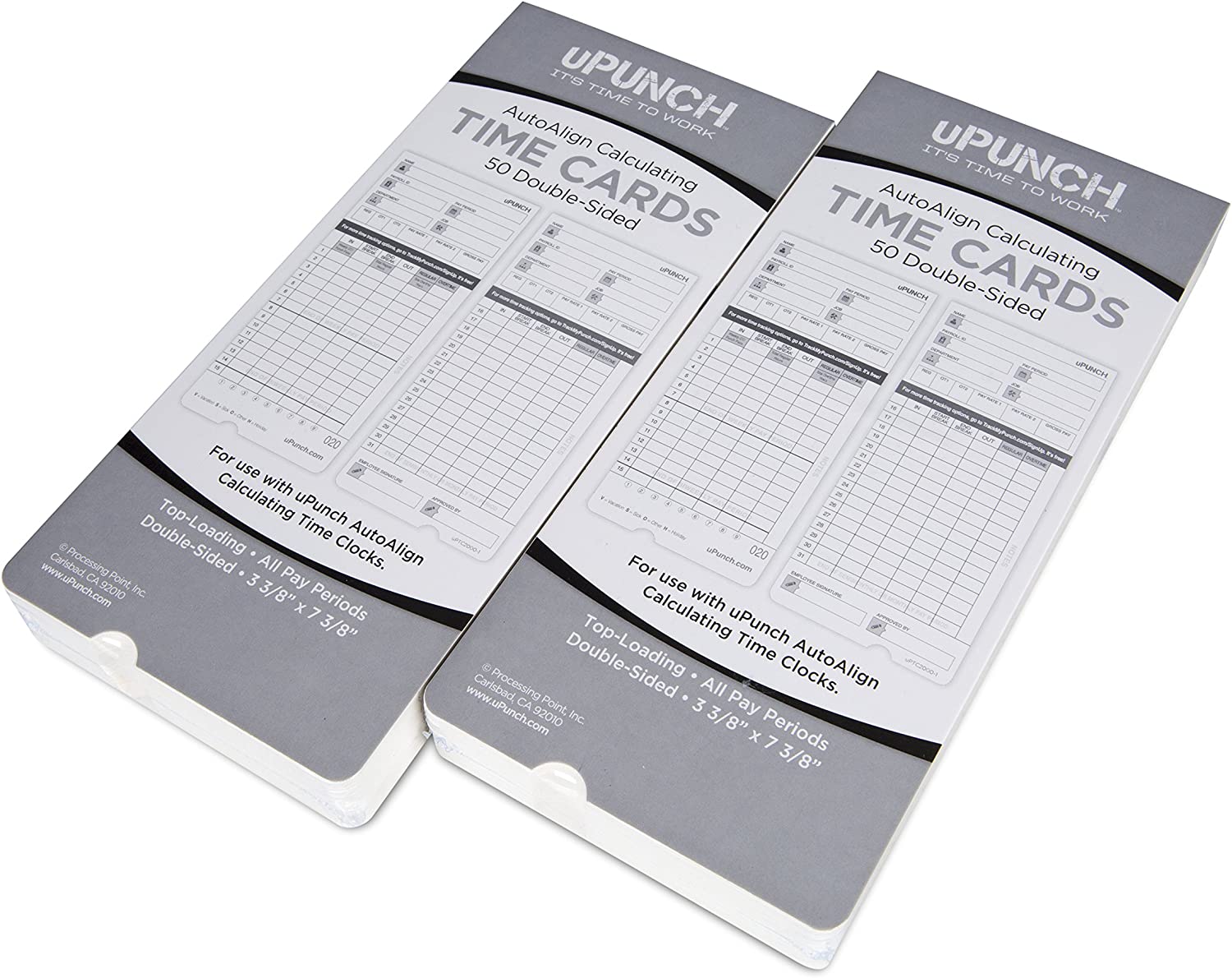 These high quality time cards work seamlessly with your uPunch HN2000 and HN4000 Auto Align Calculating Time Clocks and HN4500 bundle. They are designed for precise and accurate in and out punches across four columns for all time periods.