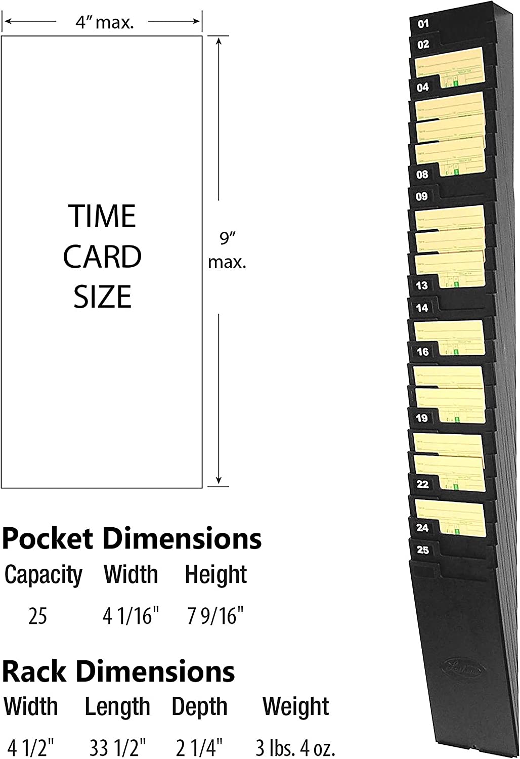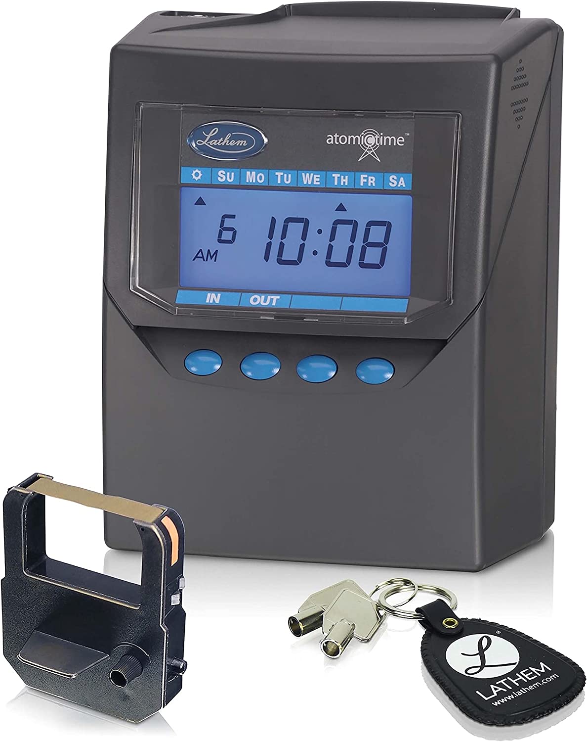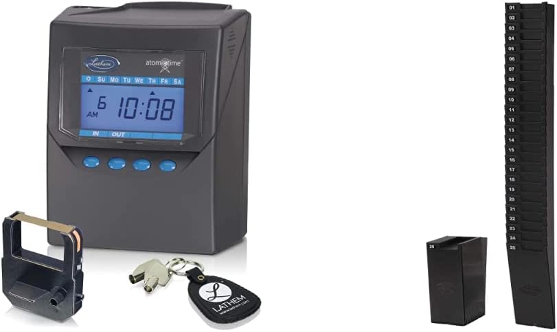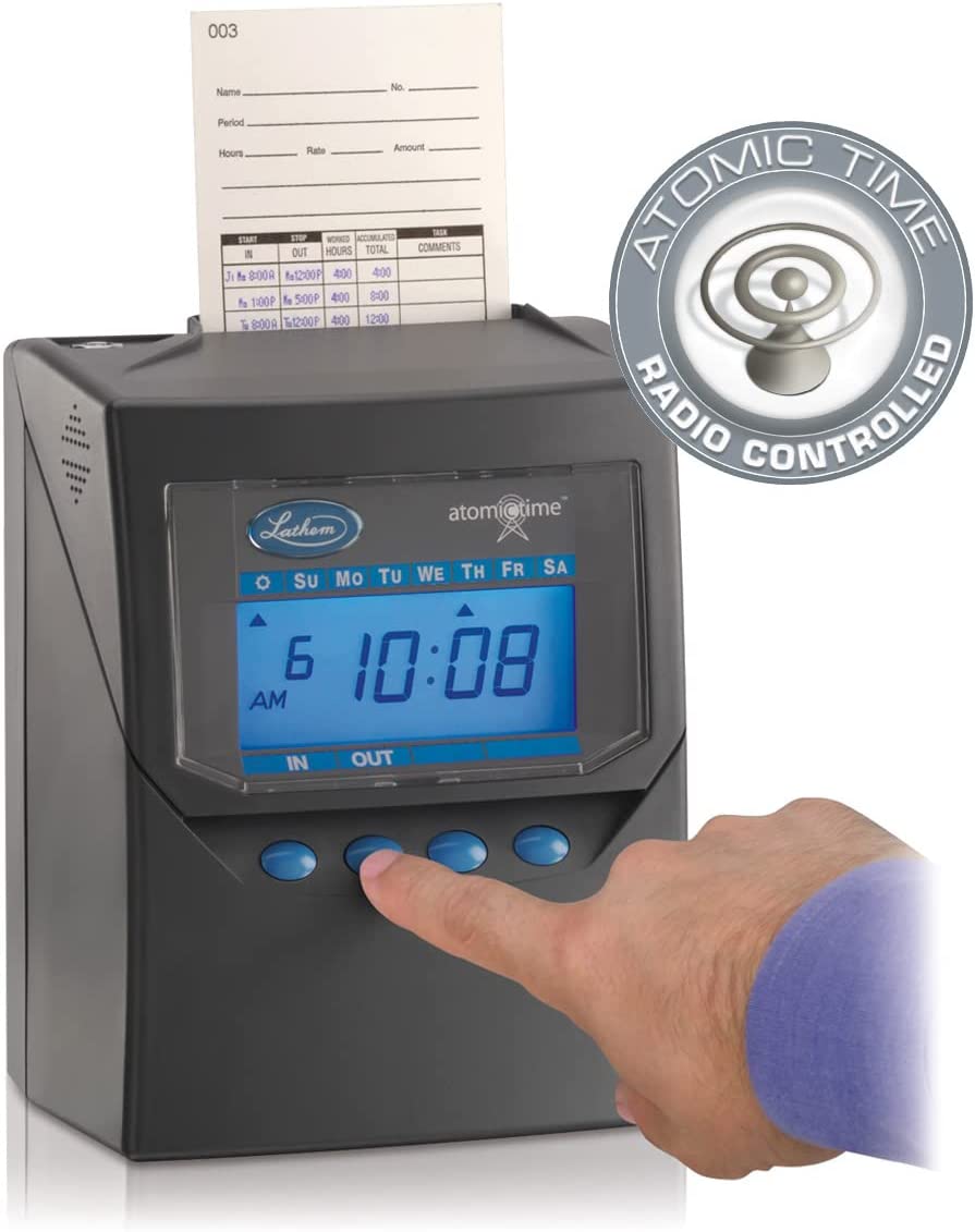 Time recorder automatically calculates worked time between punches and accumulates totals on the card for up to 100 active employees or jobs. The 7500E also synchronizes time to the U.S. atomic clock and automatically adjusts for Daylight Saving Time for accurate results. Use automatic time recorder for all pay periods or set to job mode for accurate costing information. Time recorder calculates actual or rounded time and supports an automatic break deduction from daily totals. Automatic print alignment and auto-sensing of card front and back eliminates operator mistakes and reduces time required to punch in and out. The internal lithium battery maintains the time, card totals and program settings for up to three years without power. Time recorder features a plastic case. Optional rechargeable battery keeps unit fully operational for up to 24 hours in case of a power failure.