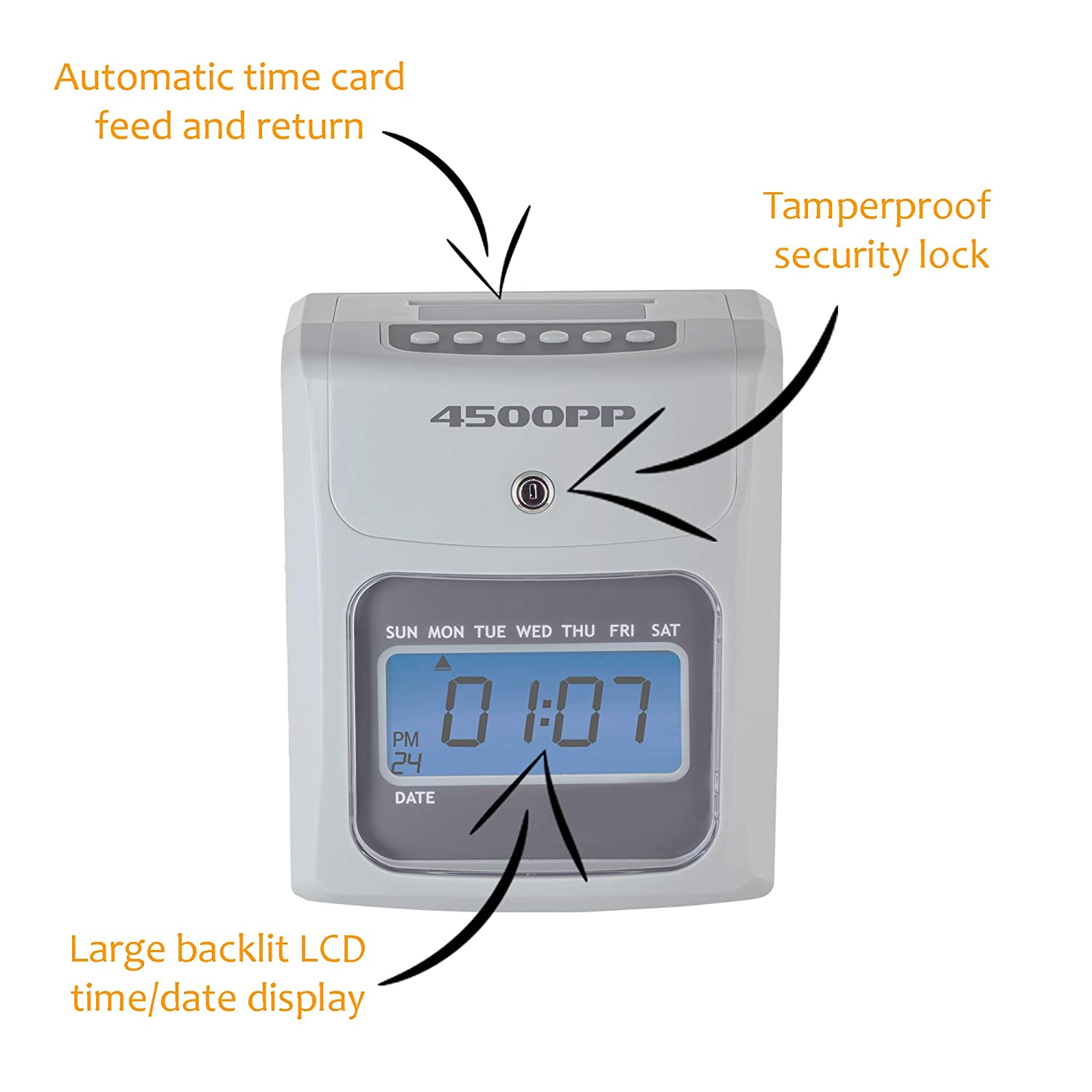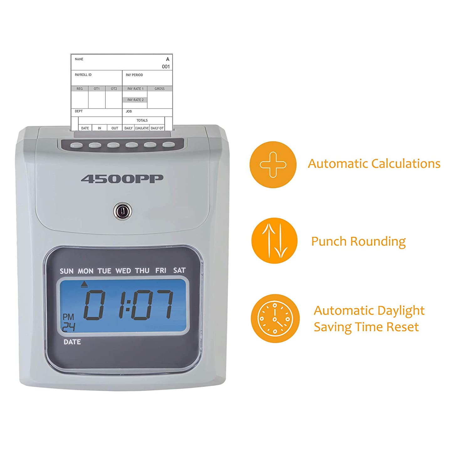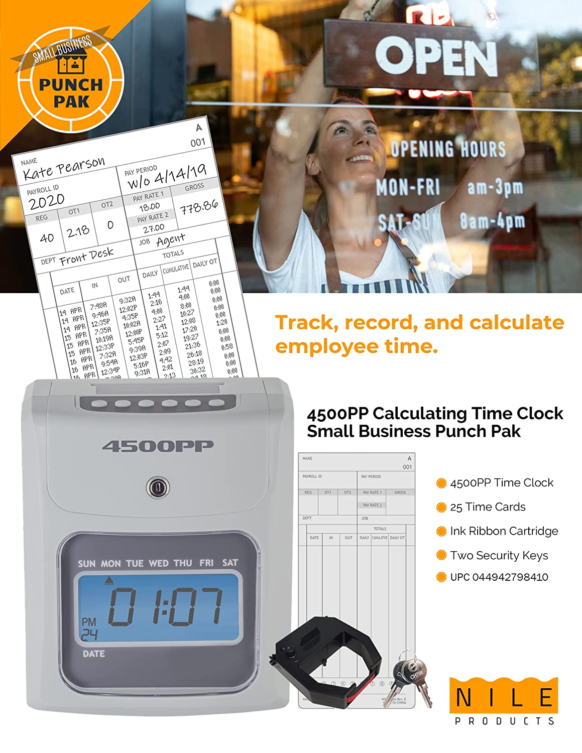 Track and record employee time and attendance with this small business time clock bundle. The Nile Products 4500PP time clock small business punch pack equips your business with everything you need to get started, including the Nile Products 4500PP electronic calculating time clock, 25 time cards, one ink ribbon, and two security keys. Records employee in and out punches on a six column time card and calculates worked hours between punches, and cumulative hours per pay period for up to 50 employees. Prints date, month, in and out punch times, total time between punches, cumulative time, and daily overtime. The automatic time card feed aligns date, in and out punch times, daily time, cumulative hours and overtime across six rows. The time clock totals actual or rounded time, including 0, 5, 10, and 15 minute rounding rules. Large backlit LCD time and date display. Features a tamperproof security lock to protect clock settings. Care free automatic reset for short months, leap year and daylight saving time. 1 year manufacturer warranty. This time clock is simple to program, and can be easily mounted on a wall or table. Automatically aligns time cards for precise punching and printing.