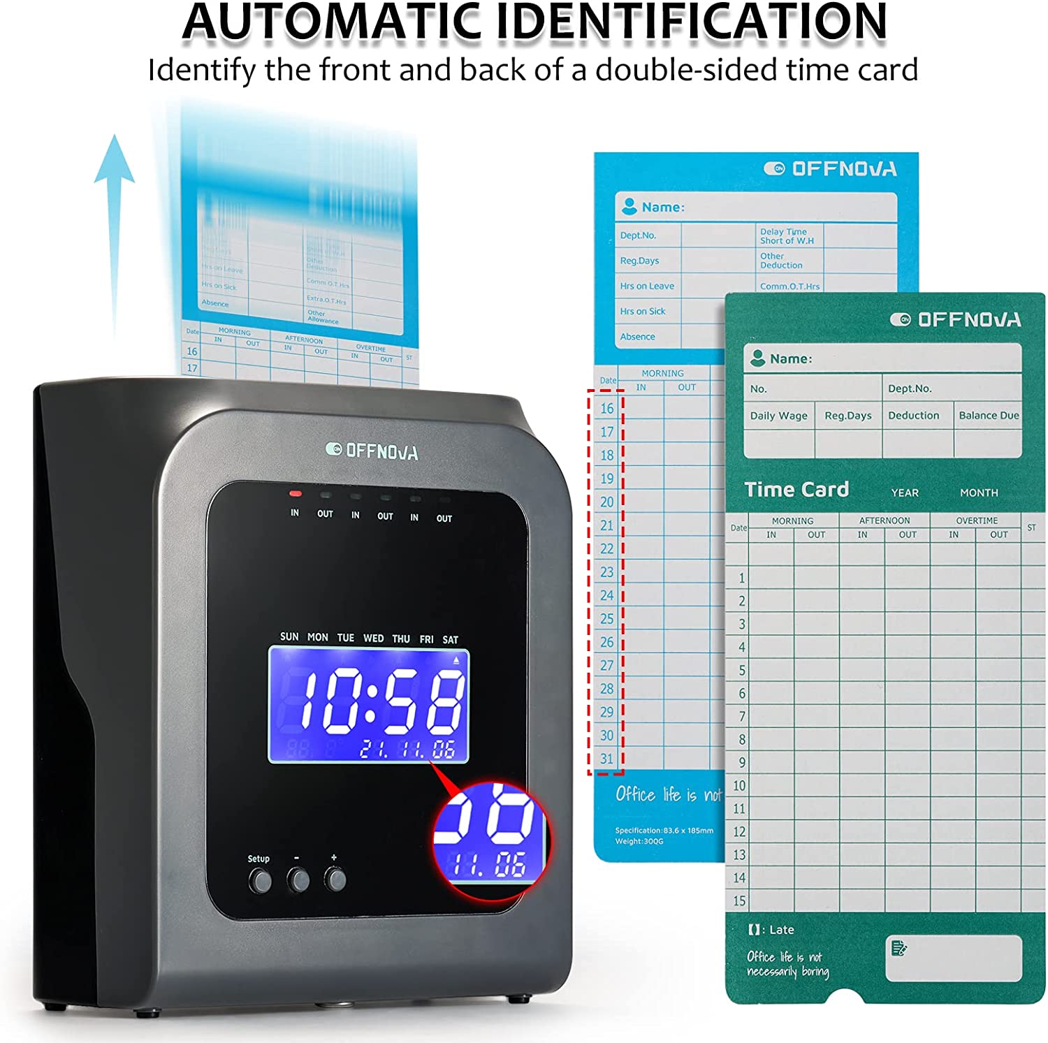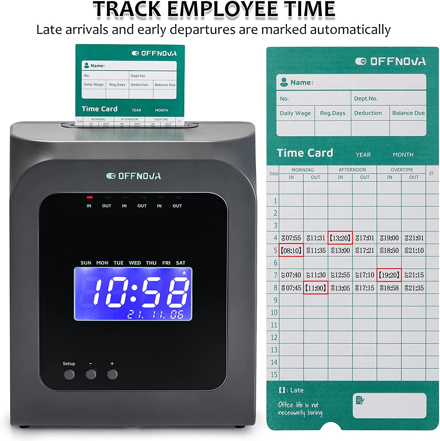 • 【Track Employee Time】24-hour time clock. 6-column, two-sided time card records up to three IN/OUT print cycles per day up to 31 days. The employee's late arrivals and early departures are marked automatically on the card. 50 specified thermal time cards and 2 sets of keys prevent time theft and make tracking the time and attendance of your employees never been simpler.