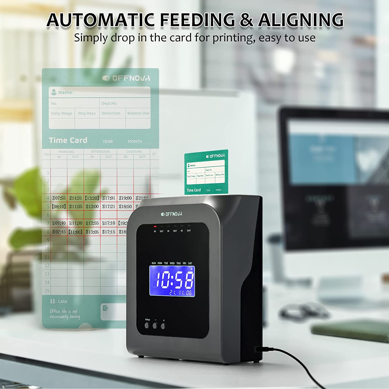 • 【Easy One-hand Operation】Automatic feeding, aligning, and printing activation allow for simple one-hand operation. Simply insert the card into the top and the time clock will automatically feed the card into the correct alignment, print the information, and eject the card. Employees can do everything with one hand, making the process quick and simple.
