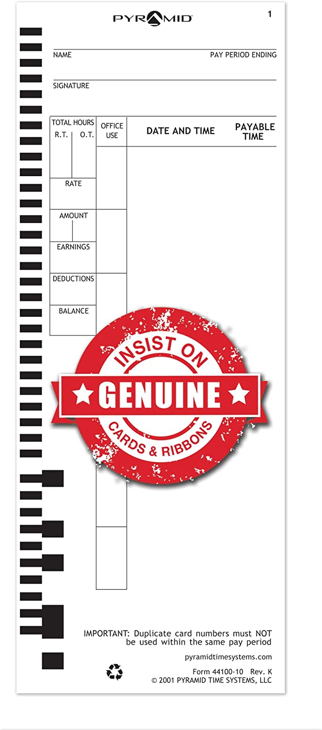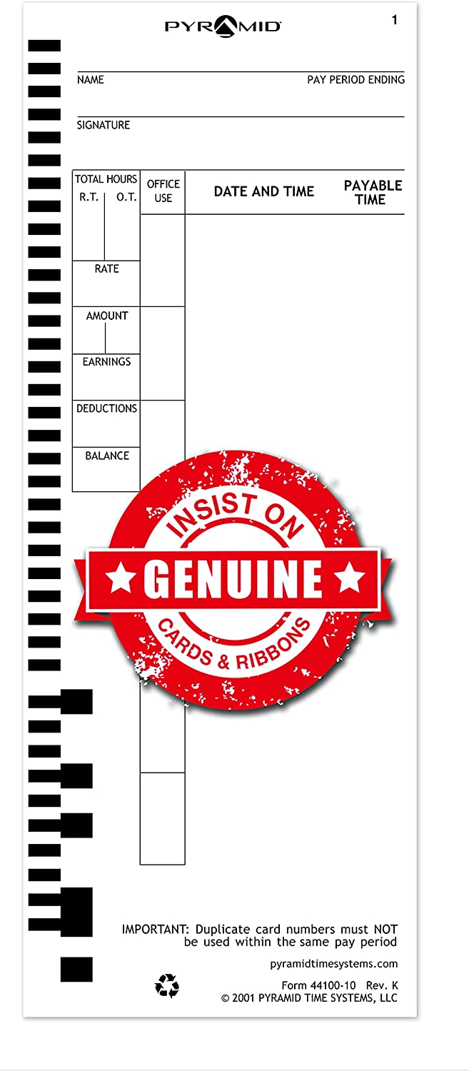 Pyramid Time Systems 44100-10MB Authentic and Genuine Time Cards are designed to work directly with the Pyramid models 4000, 4000Pro, 4000ProK & 4000HD Pyramid time clocks. Sold in 1000 units per pack. Each card is set to record the following: Week Ending, Employee Name, Signature, Total Hours, Office Use Line, Date & Time, Total Payable Time, Rate, Amount, Earnings, Deductions and Balance. Week Ending, Employee Name, Signature, Total Hours, Office Use Line, Date & Time, Total Payable Time, Rate, Amount, Earnings, Deductions and Balance. This set of cards ships in a 1000 pack and made with 30% post-consumer recycled content. Since 1969 Pyramid Time Systems has kept their eyes on the clock. Timekeeping has always been their solitary focus. Pyramid Time Systems has grown and matured into a respected authority in time stamps, time clocks, time and attendance software and synchronized wall clock systems, and all related accessories, including genuine Pyramid Time Systems time cards and time card racks.