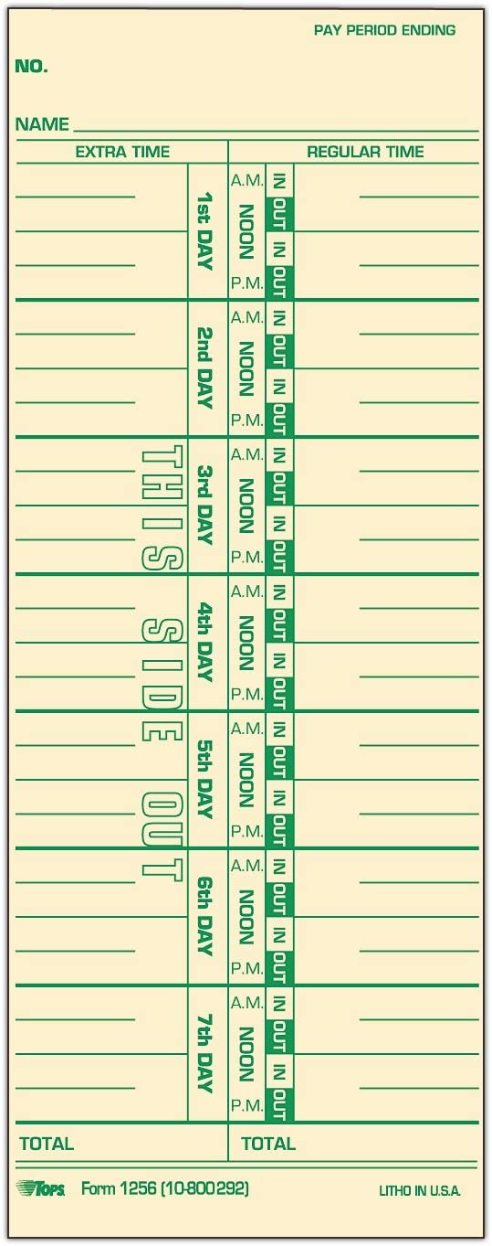 Since 1952, TOPS has provided quality products and services to businesses throughout the world. TOPS continues that commitment providing innovative, high quality value-added products for the office, school and home. TOPS time cards are the equivalent to time clock manufacturer's time cards. Made from heavyweight 143 lb. manila stock, the TOPS time cards are printed on the front with green ink. Featuring a seven day time period to record regular and overtime hours. Each card measures 3.5 x 9 inches, and there are 500 time cards per pack. Replaces Card No. 30, 1912R, and 10-800292. Time Clock Compatibility: Acroprint 125, 150, 175, ES700, ES900, ESP180, Amano PIX, TCX series, Lathem 900E, 1200 series, 1500E, 2000 series, 4000 series, 5000EP. Whether it's notebooks, writing pads, record books, time cards, or any of the hundreds of items we offer, you can count on TOPS products to help.