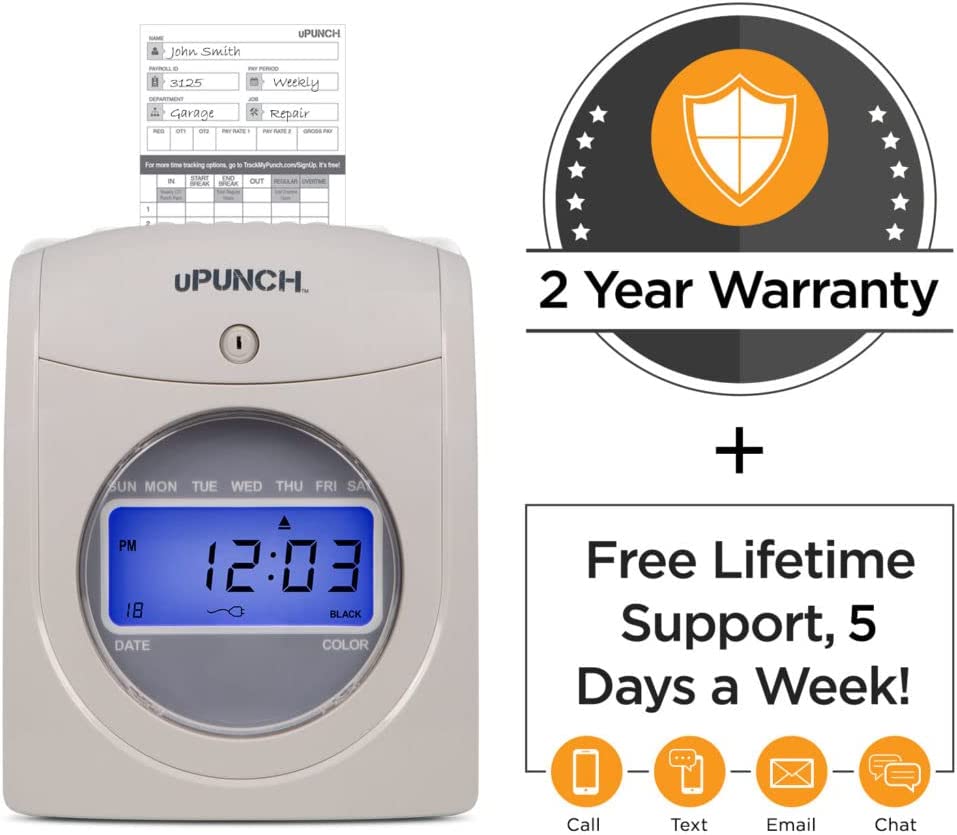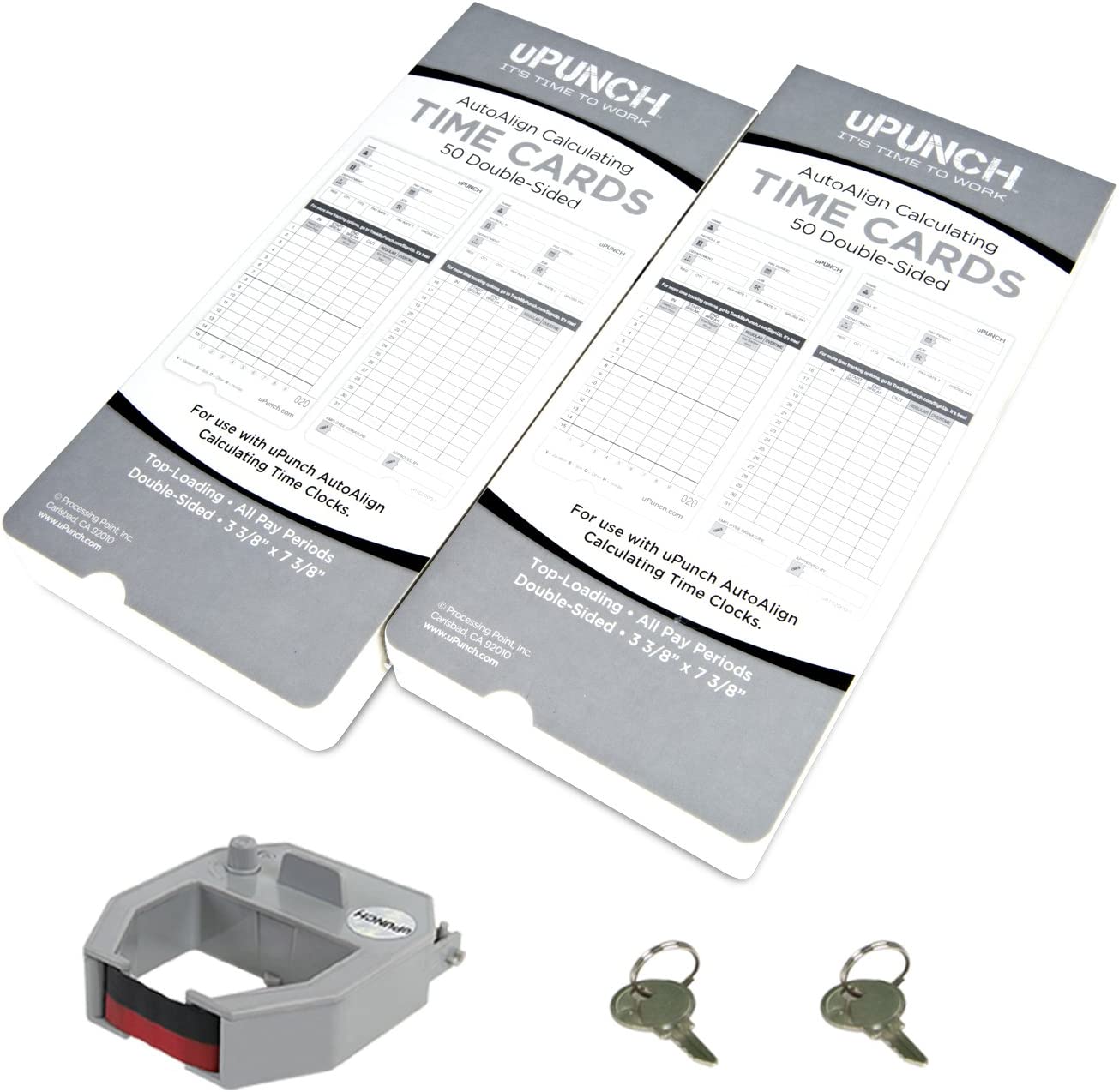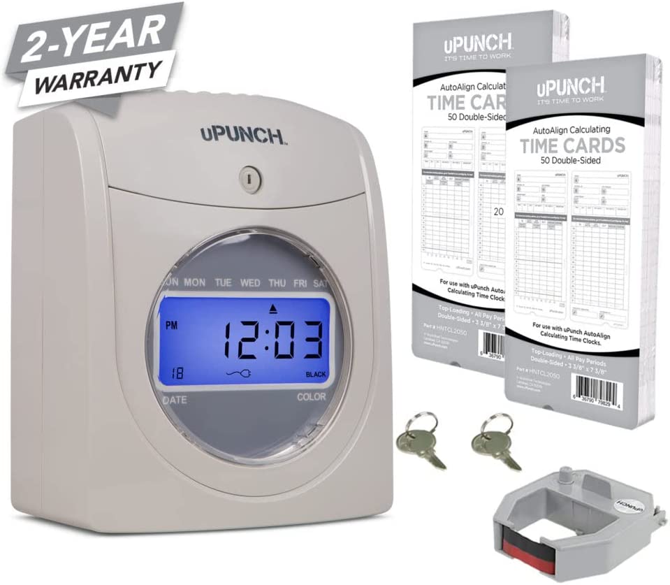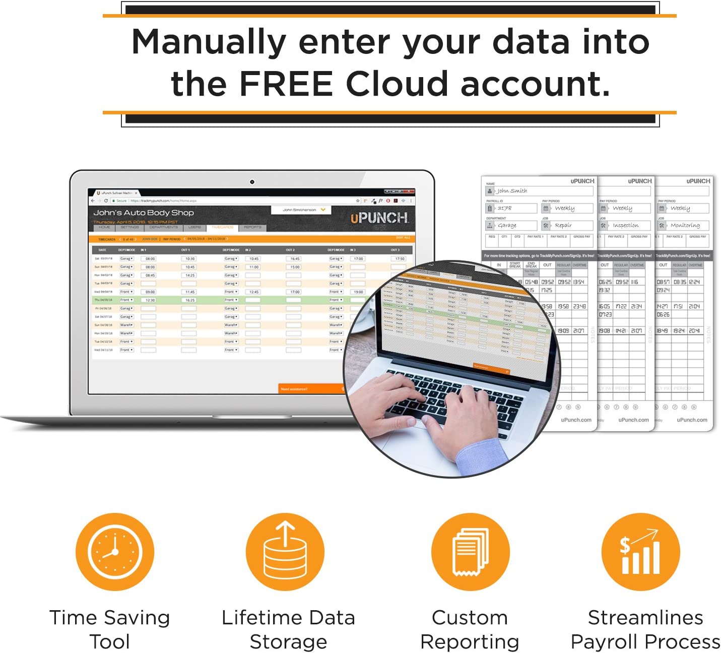 Take your punch card time clock to the cloud with this electronic calculating time clock bundle. This time clock bundle gives you everything you need to start managing your employee time and attendance, including one uPunch HN4000 electronic calculating time clock, 100 time cards, two keys, and one ink ribbon. Not only does the HN4000 allow employees to punch in and out with the ease of a traditional punch time clock, but it automatically tracks and calculates employee hours on paper timecards. The free cloud software gives you the ability to manually enter employee hours worked. This device does not connect to the internet and does not send data automatically to the cloud. From the software you can run pay period reports, track daily or weekly overtime, export to payroll systems, and simplify payroll recording and data organization for your company. The time clock is easy to mount on a wall or table and Program, while the automatic card feed feature aligns timecards for accurate punching and printing. The flexibility of the HN4000 allows you to use the clock as a stand-alone time clock or in conjunction with our free cloud-based software.