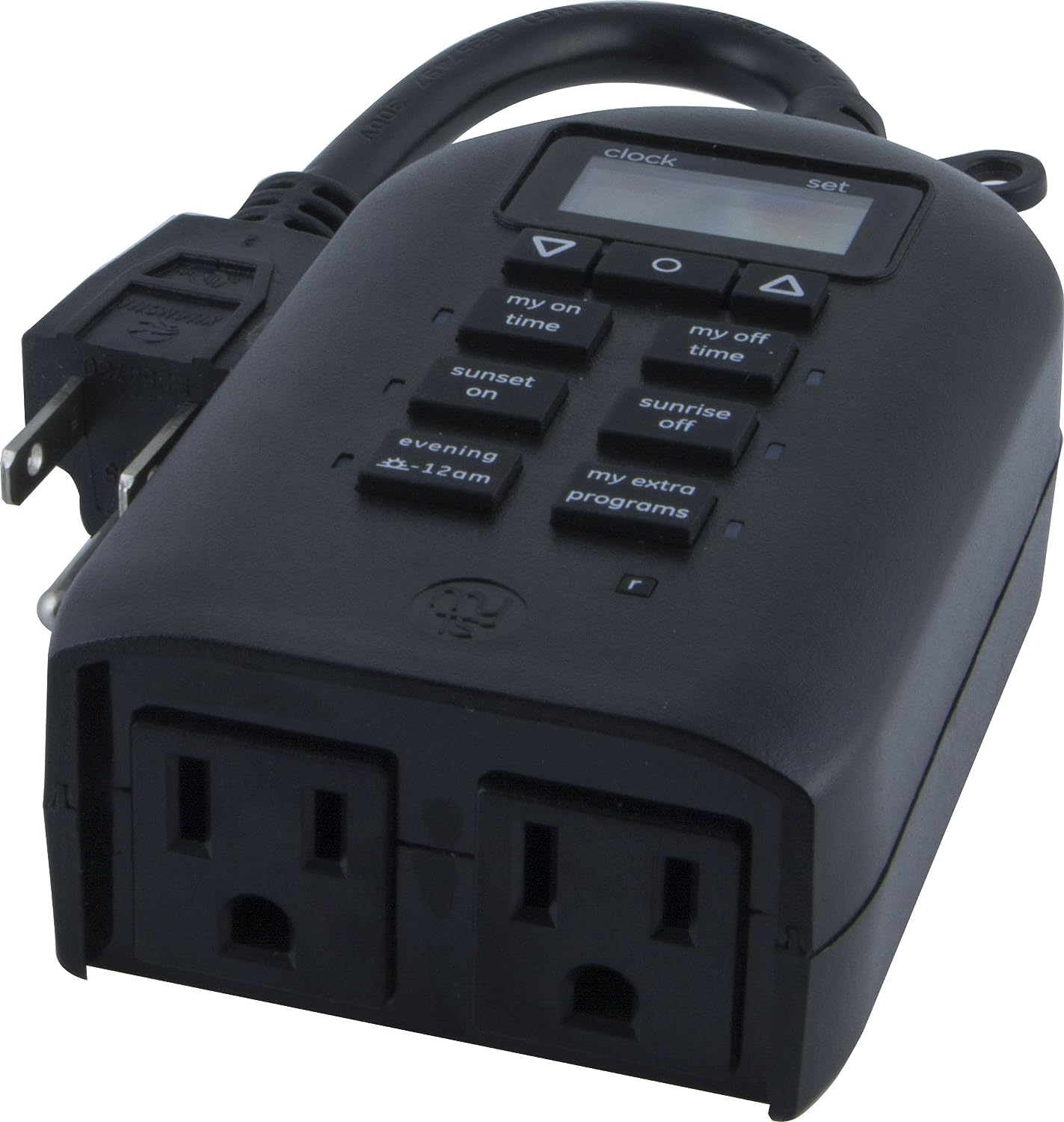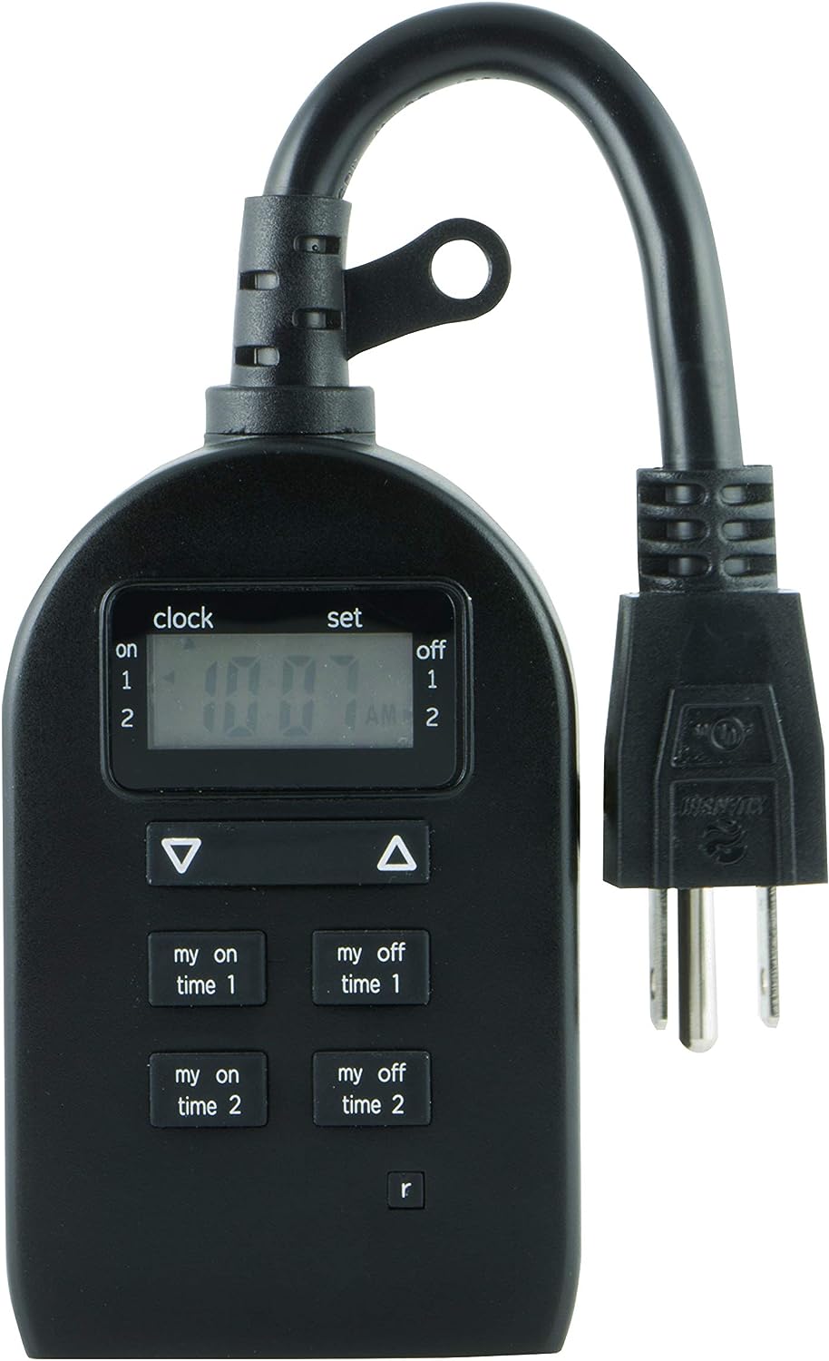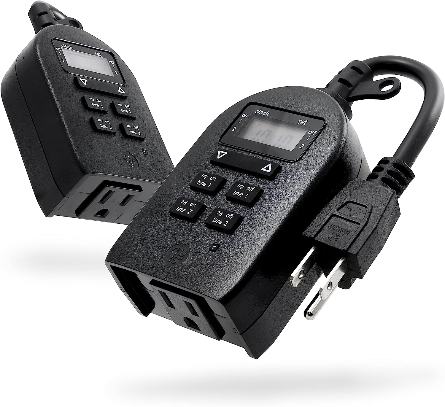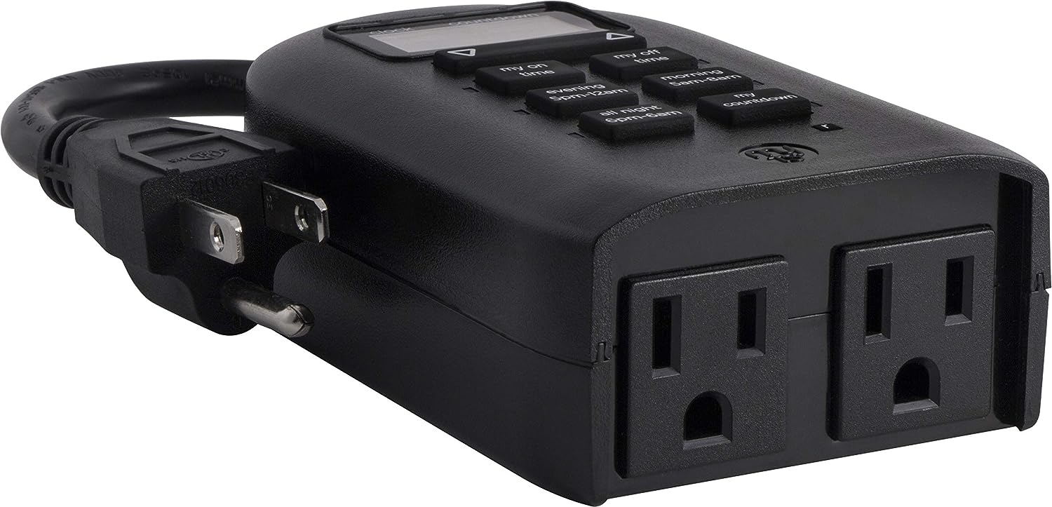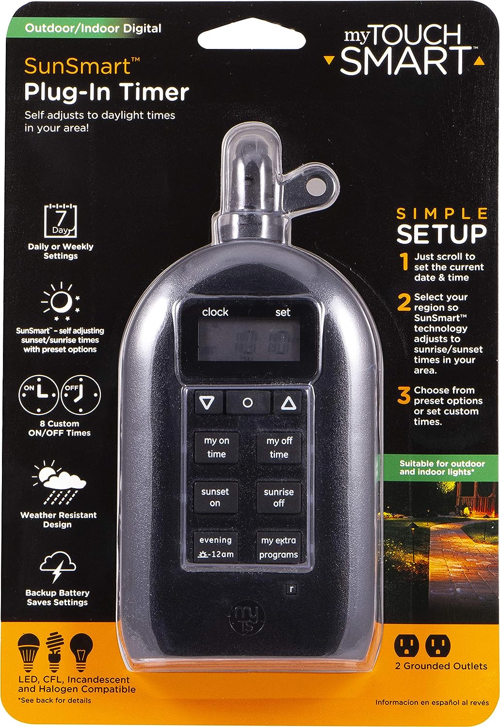 Save energy, save money and feel secure with plug-in outdoor/indoor digital timers. Featuring a single grounded outlet, The timer delivers simple automation for your Landscape, patio or seasonal lighting. It is equipped with 2 custom "my on/off time" Buttons, enabling you to easily program your lights to turn on and off for any time that suits your Schedule. Suitable for outdoor use, the timer is weather resistant and can easily be mounted near any available outlet with the attached mounting bracket. The plug-in outdoor/indoor digital timer offers a fast and easy set-up, while also featuring A large LCD screen for effortless viewing. Timers are an incredibly easy way to automate your lights to be on when you need them most and are compatible with CFL, LED, incandescent and halogen light sources.