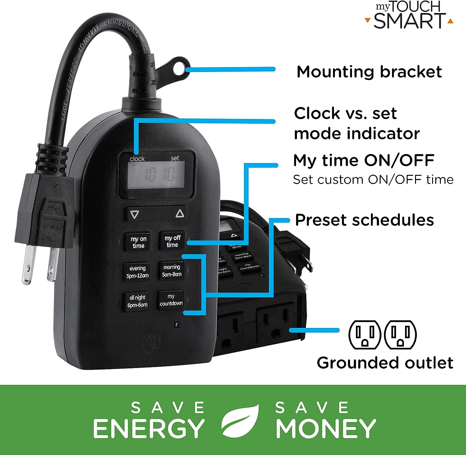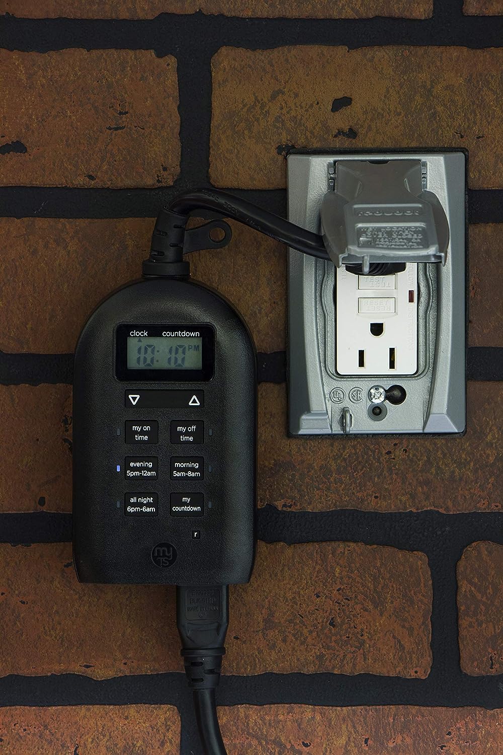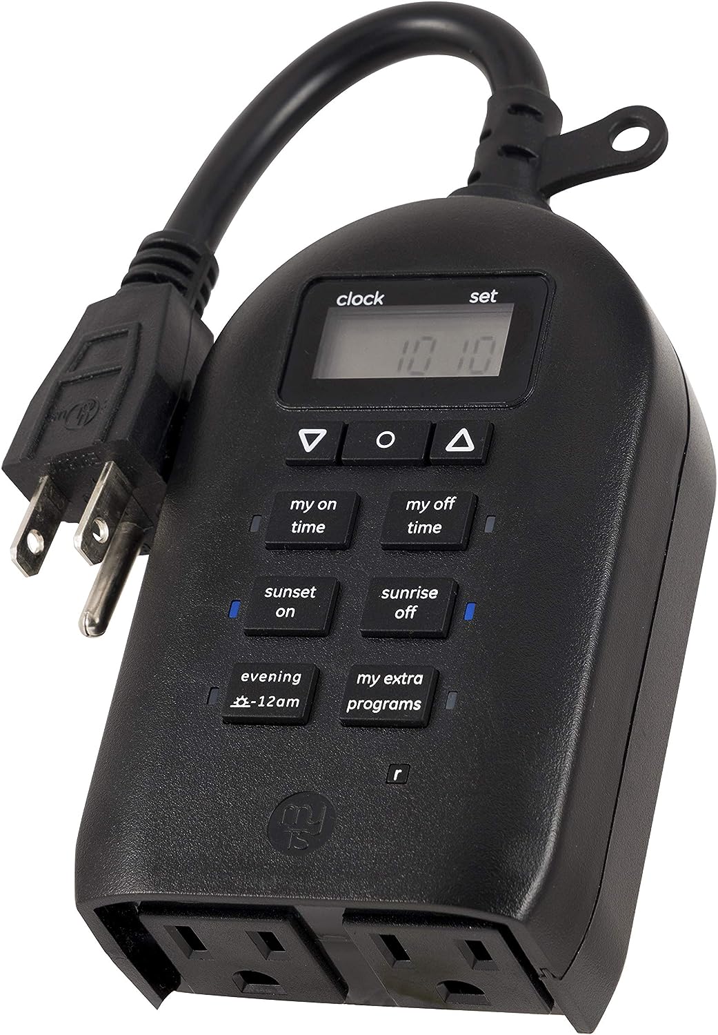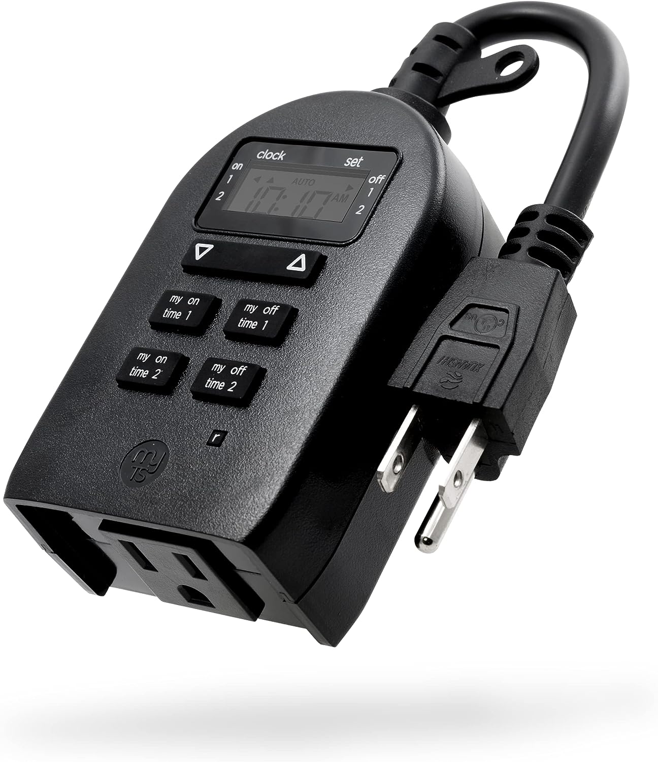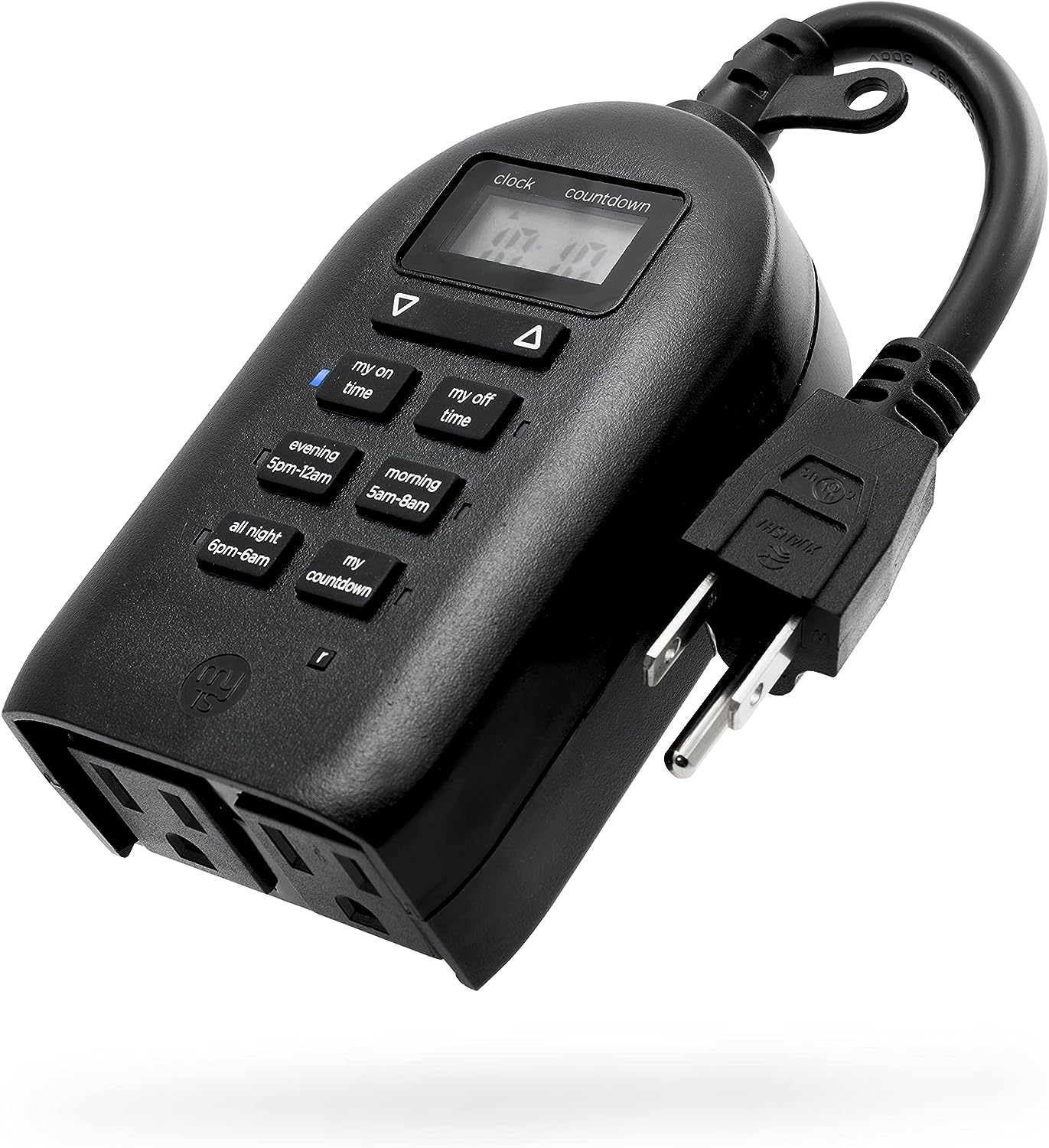 Save energy, save money and feel secure with plug-in outdoor/indoor digital timers. Featuring a single grounded outlet, The timer delivers simple automation for your Landscape, patio or seasonal lighting. It is equipped with 2 custom "my on/off time" Buttons, enabling you to easily program your lights to turn on and off for any time that suits your Schedule. Suitable for outdoor use, the timer is weather resistant and can easily be mounted near any available outlet with the attached mounting bracket. The plug-in outdoor/indoor digital timer offers a fast and easy set-up, while also featuring A large LCD screen for effortless viewing. Timers are an incredibly easy way to automate your lights to be on when you need them most and are compatible with CFL, LED, incandescent and halogen light sources.