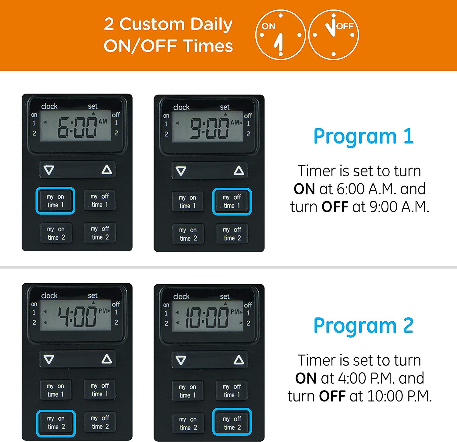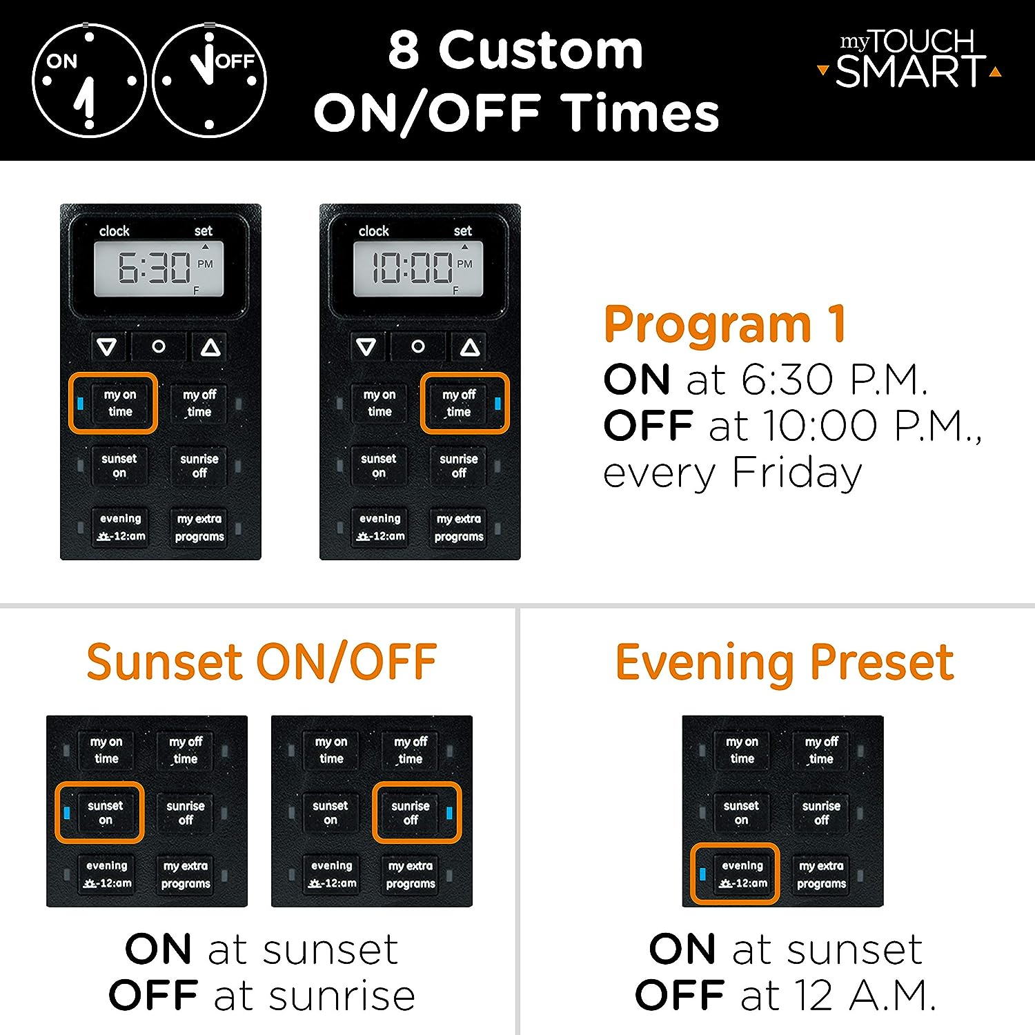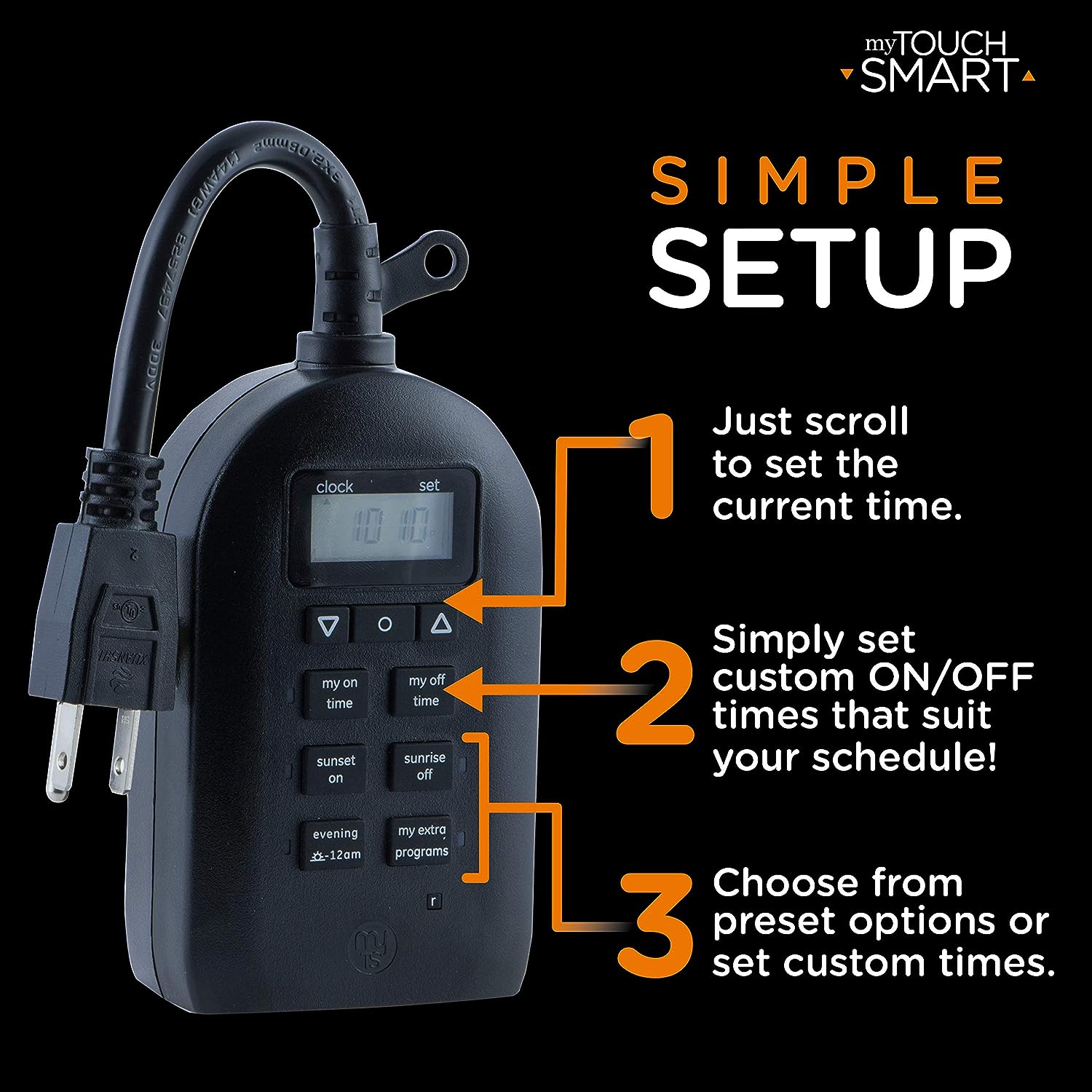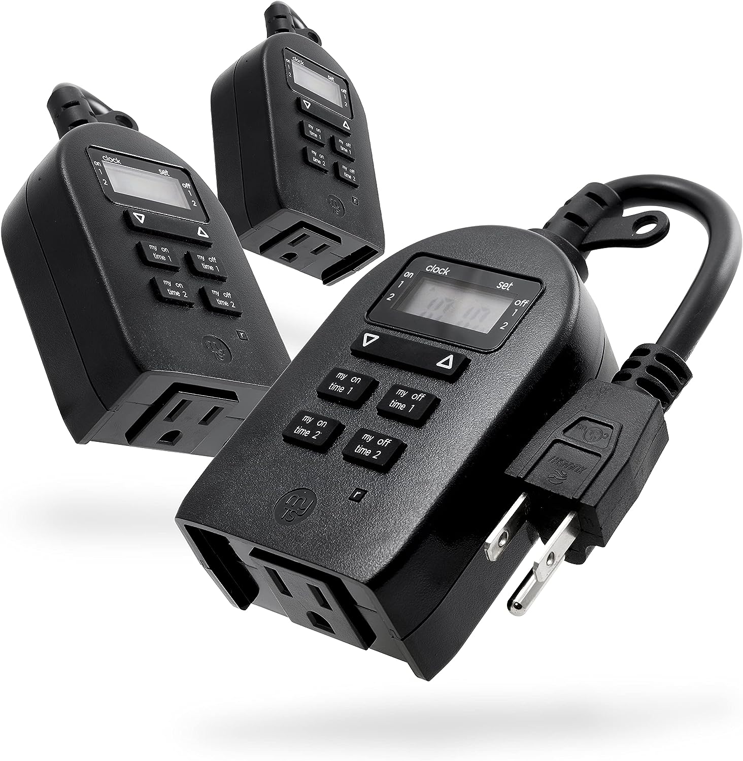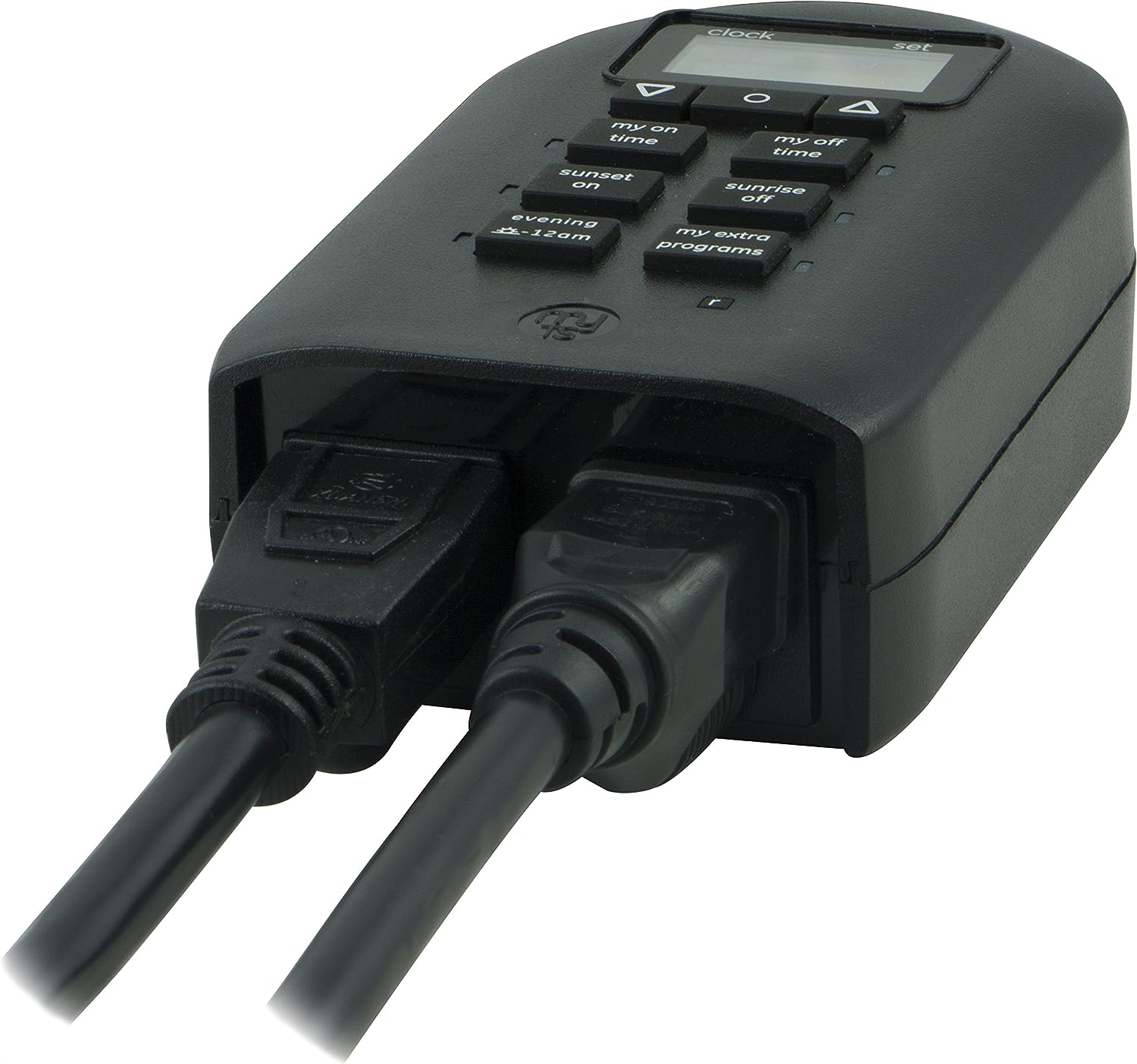 Save energy, save money and feel secure with plug-in outdoor/indoor digital timers. Featuring a single grounded outlet, The timer delivers simple automation for your Landscape, patio or seasonal lighting. It is equipped with 2 custom "my on/off time" Buttons, enabling you to easily program your lights to turn on and off for any time that suits your Schedule. Suitable for outdoor use, the timer is weather resistant and can easily be mounted near any available outlet with the attached mounting bracket. The plug-in outdoor/indoor digital timer offers a fast and easy set-up, while also featuring A large LCD screen for effortless viewing. Timers are an incredibly easy way to automate your lights to be on when you need them most and are compatible with CFL, LED, incandescent and halogen light sources.