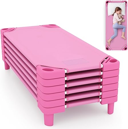 KOTEK Stackable Sleeping Daycare Cots for Kids, Portable Toddler Nap Cots, 52" L x 23" W, Ready-to-Assemble, Space-Saving Children Naptime Cot for Classroom Preschool (Set of 6, Pink)
