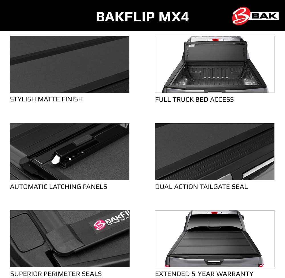 The BAKFlip MX4 was the first matte-finished, hard folding cover to market, becoming America’s #1 Selling Hard Folding Cover in just a few years. Simply put, the MX4 just looks better than other covers. Its sleek no-profile appearance allows you to maintain the appearance of your truck, while enabling you to securely stow cargo in the bed. The MX4’s pioneering, textured matte-finish adds a premium look and feel while also protecting against UV damage, annoying finger print marks, and scratches. MX4 has everything you expect from a premium cover. The engineers at BAK Industries fine-tuned even the smallest elements of the cover, down to adding cab corner caps and rail-end cap, to extending a matte-finish throughout the cover’s side rails, clamps, and elevator bolts. The MX4’s integrated buckle system and automatic latching mechanism allows you to drive with the cover partially or fully opened without covering the 3rd brake light. For 100% bed access, simply unlock the cover from either side via its pull latches and fold the cover all the way up against the cab. From there, you can prop the cover in place by tightening two rods into the underside of the panel. For enhanced durability, the MX4 also features pre-molded, shock-absorbent bumpers on either side of the panel, protecting the folded panels from hitting the cover during turbulent driving. Rain or shine, the MX4 provides confident cargo storage that’s complete with dual drain tubes to divert water away from the truck bed, as well as full perimeter seals to help protect against water intrusion. Finally, the MX4 can hold up to 400lbs of evenly distributed weight and is backed by a 5-year, hassle-free warranty. BAKFlip MX4 is proudly made in the USA with globally sourced materials with a US-based support team. .