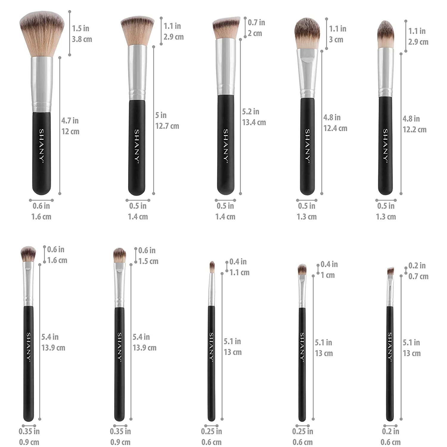 • Includes powder, blush, foundation, bronzer, Eye shadow, concealer, and contour brushes.