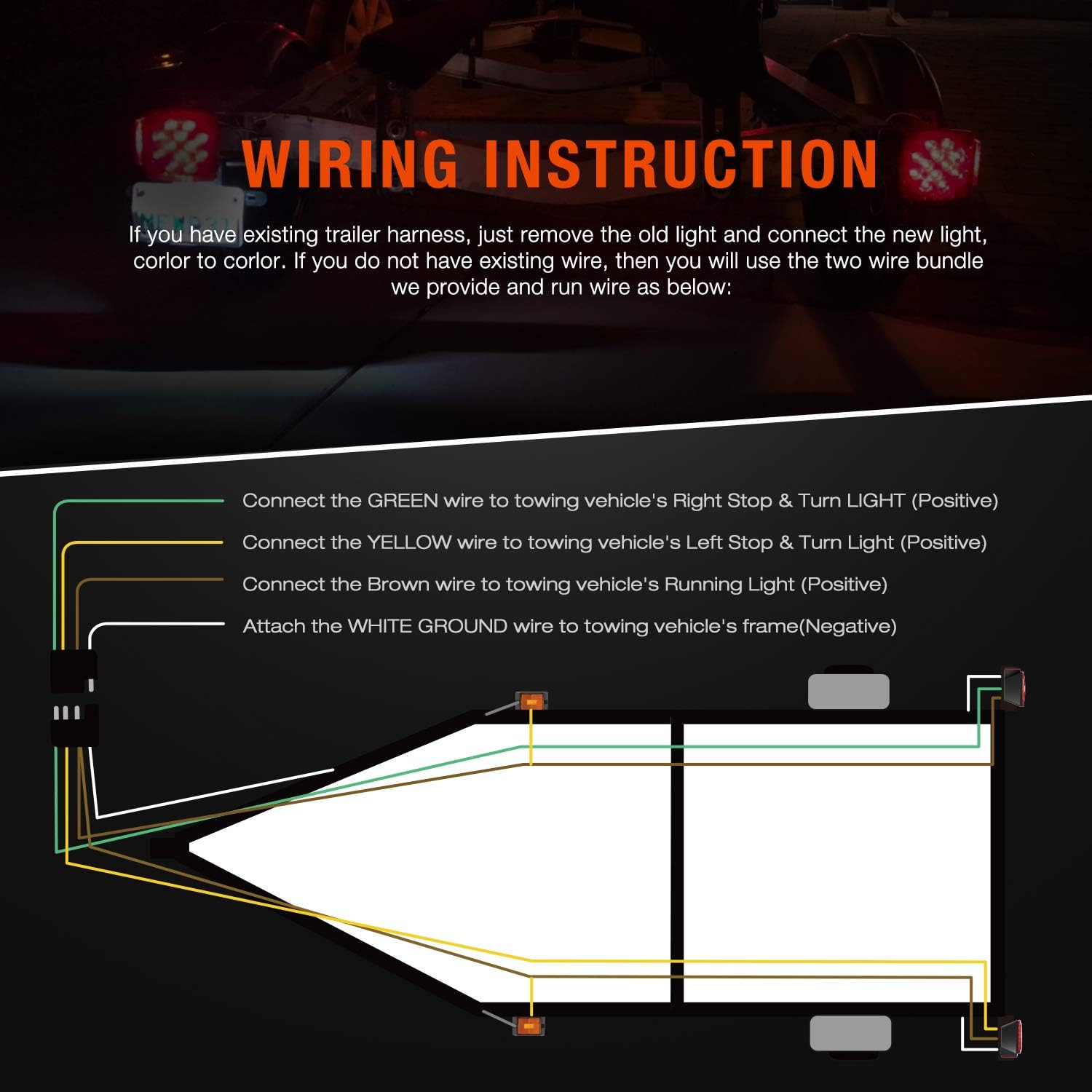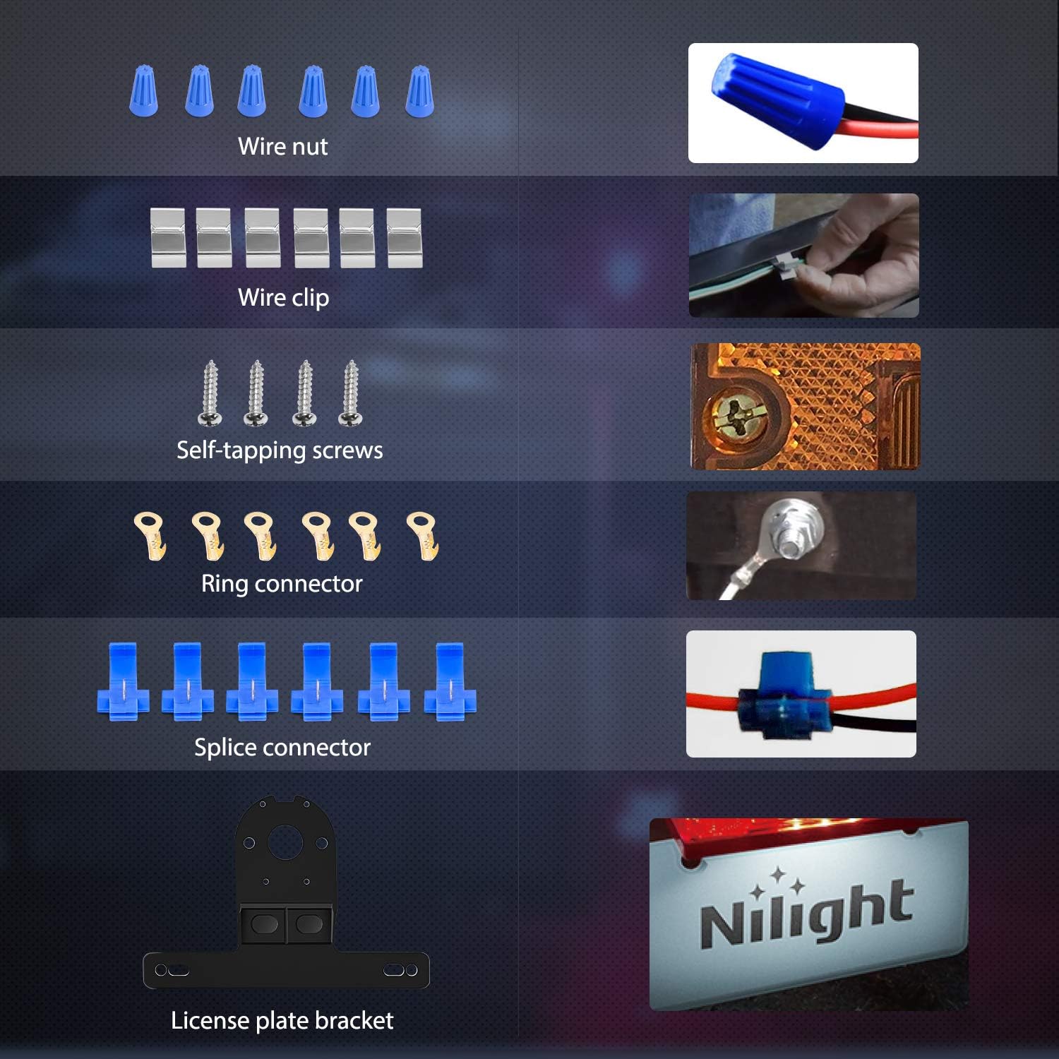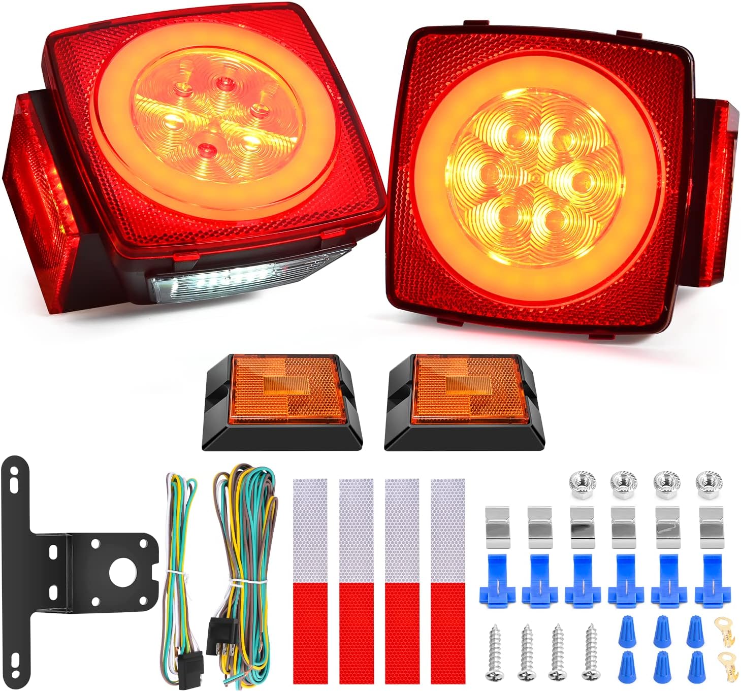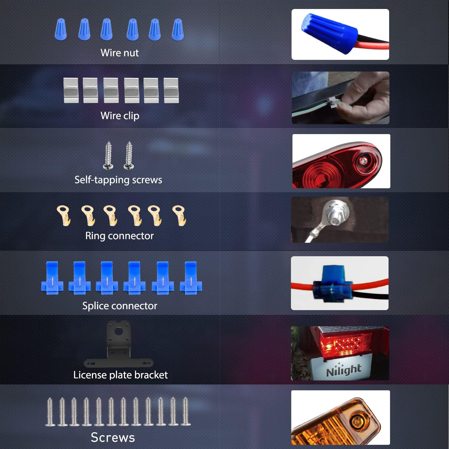 Nilight Submersible Square LED Trailer Light Kit Combination of stop turn tail, side marker,side reflector, rear reflector, license plate light for your safe driving. Operating voltage: 12VDC Amperage Draw: 0.05A-0.2A LED quantity: 22PCS at left lamp, 16PCS at right lamp LED Type: 5050 tricore red led for stop turn tail light, 2835 red led for side marker light, 2835 white led for license light Waterproof Rate: IP68 Certificate: DOT compliant Square Light dimension: 5.12”x 4.65”x 2.68" Amber clearance light dimension: 2.40" x 3.98" Square light mounting distance: 2.44" Amber clearance light mounting distance: 3.74" Wiring harness kit: 2 sets 4 pin trailer wiring harness, 21. 65 feet plus 3. 93 feet Package Includes: 2 x square trailer lights, 2x amber clearance light, 2 x trailer harness kit, 1 x license plate bracket,4x reflector, 1 x hardware pack.