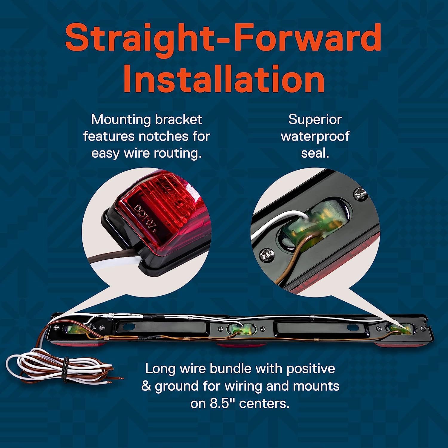 • STRAIGHT-FORWARD INSTALLATION- Mounting bracket features notches on its short sides for easy wire routing; positive input wire and ground wire are attached; mounts on 8.5" centers.