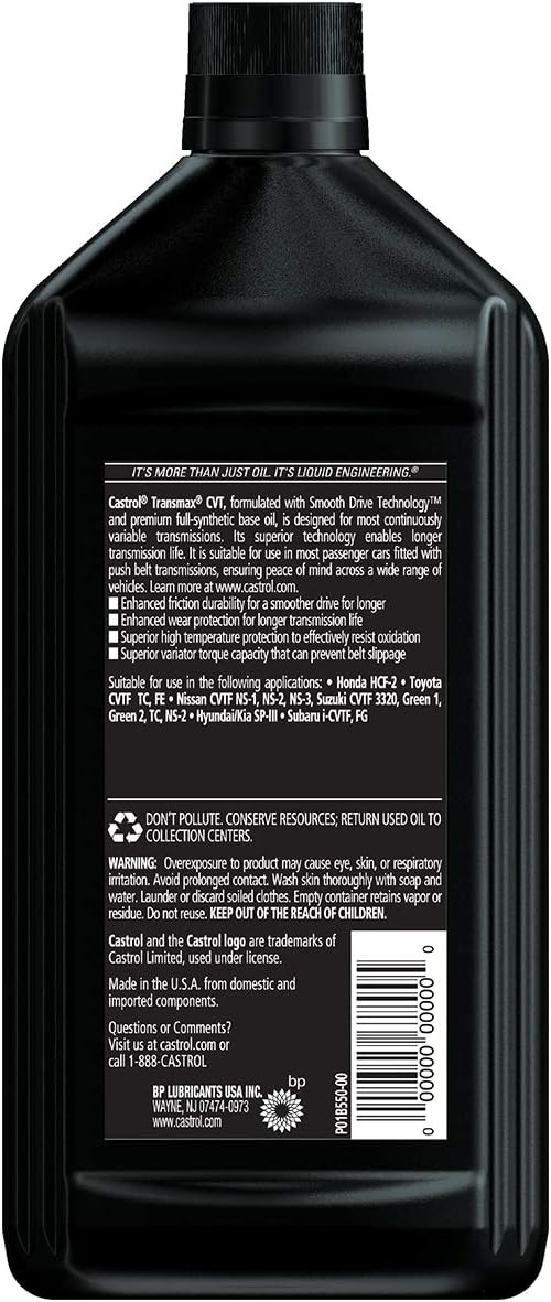 Castrol Transmax ATF/CVT Universal is a technologically advanced full-synthetic formulation designed to deliver excellent performance in most of the traditional stepped automatic transmissions and Continuously Variable Transmissions currently in use. It is blended with premium base oils and an additive package which utilizes Castrol Smooth Drive Technology. This is the first Castrol multivehicle ATF suitable for use in both step-shifting and continuously variable automatic transmissions. Transmax ATF/CVT Universal is suitable for use in vehicles manufactured in North & South America, Europe, and Asia.