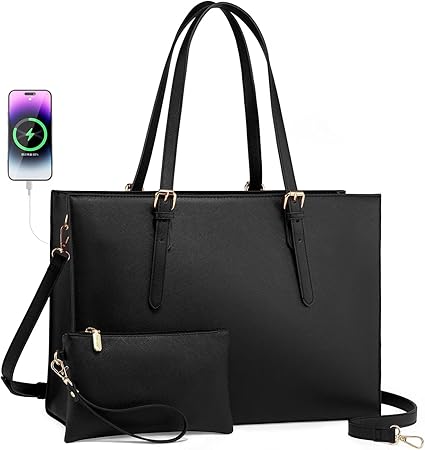LOVEVOOK Laptop Tote Bag for Women, Large Briefcase for 15.6 Inch Computer Waterproof PU Leather Shoulder Bag with USB Charging Port, Business Office Work Shoulder Handbag Purse 2Pcs Set, Black