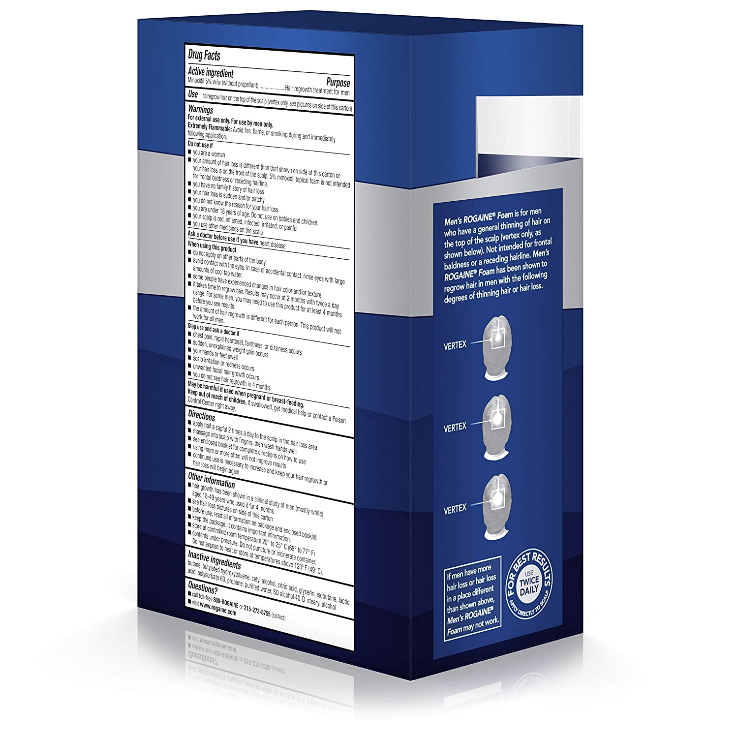 Help treat hair loss and regrow fuller hair with Men's Rogaine 5% Minoxidil Topical Foam. Ideal for use at the early stages of hair thinning, this fast-working hair regrowth treatment is clinically proven to regrow up to 25% more hair in 12 weeks. Unlike hair loss shampoos and hair thickening products that temporarily plump hair from the outside, Rogaine penetrates the scalp to reactivate shrunken hair follicles, allowing for regrowth of hair. The 5% Minoxidil formula works to boost hair follicle activity and hair protein production, while Tricho-Prime Technology uses a proprietary combination of ingredients to create an optimal environment for hair regrowth. This men's hair re- growth treatment also contains botanical extracts and emollient to help maintain a healthy, conditioned scalp, plus alphahydroxy acid (AHA) to promote natural skin exfoliation to help keep follicles open. It comes in a no-mess foam that is easy to use and is designed to fit easily into your routine.