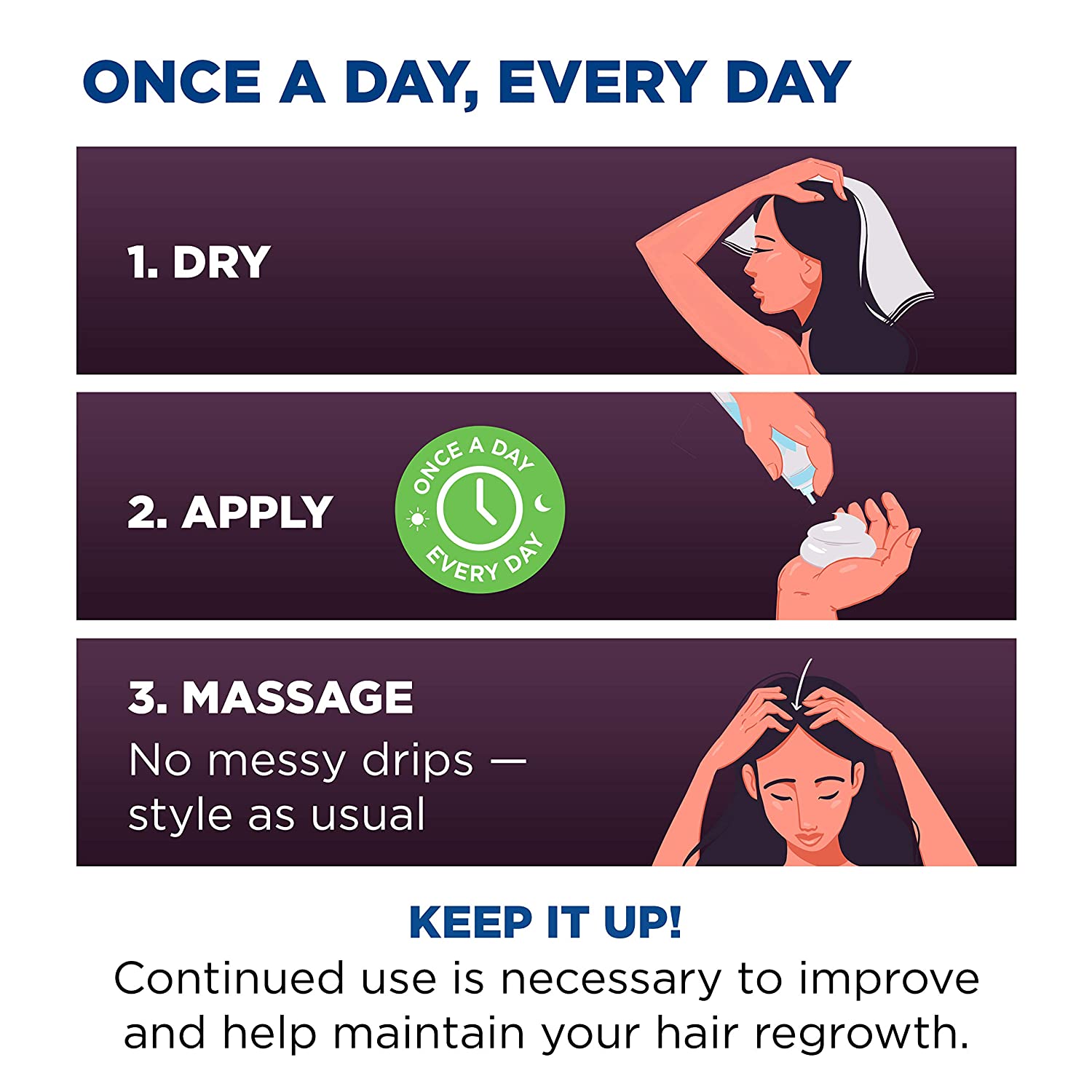 Help treat hair loss and regrow fuller hair with Women's Rogaine 5% Minoxidil Topical Foam. Ideal for use at the early stages of hair thinning, this hair regrowth treatment is specially formulated for women and is clinically proven to regrow more hair. This thinning hair foam penetrates the scalp to reactivate shrunken hair follicles, allowing for regrowth of hair. The 5% Minoxidil formula works to boost hair follicle activity and hair protein production, while Tricho-Prime Technology uses a proprietary combination of ingredients to create an optimal environment for hair regrowth. This hair growth treatment comes in a no-mess foam that is easy to use and is designed to fit easily into your daily beauty regimen with once-daily use. Based on hair count among men and women in clinical studies performed for approval, Jan 2006.