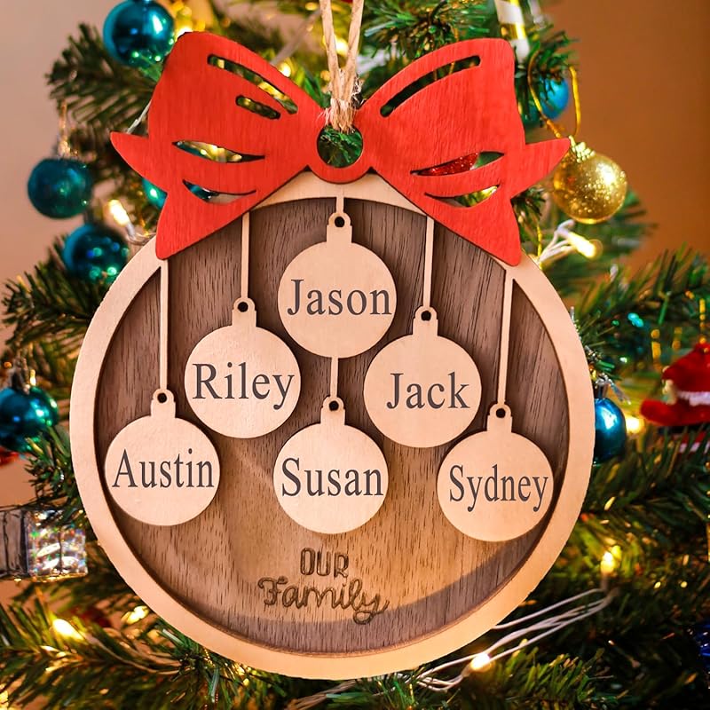 Personalized 2024 Christmas Ornaments, Customize 1-10 Names Christmas tree decoration Laser Engraved Names, Comes with a rope (5 Names, Red bow (most options))