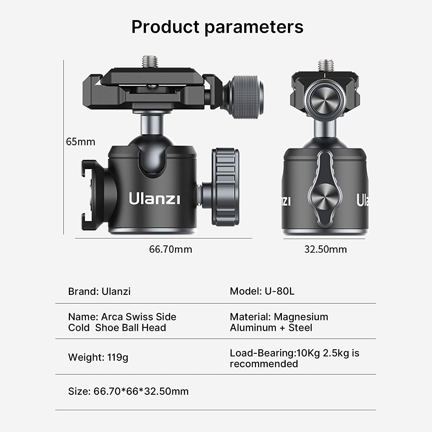 • 【All Metal, 32.5mm Diameter, 1/4" Interface】 - 1.All Metal CNC Machining, 10kg load hard core ballhead, bearing most cameras. 32.5mm diameter designed, compatible most tripods with 1/4" Interface on the market.