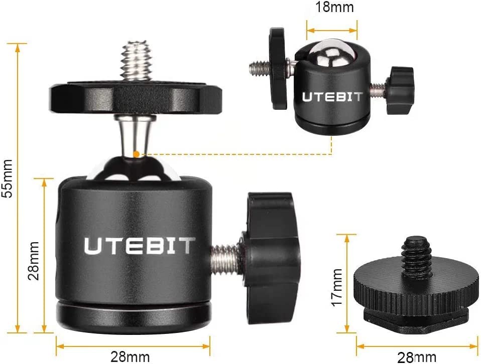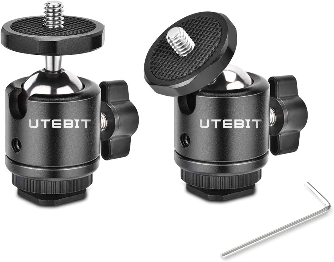 UTEBIT 2 Pack Mini Ball Head with 1/4" Hot Shoe Mount Adapter Max Load 5.5lb 360° Swivel Tripod Ball Head for DSLR Camera Camcorder, Light Bracket