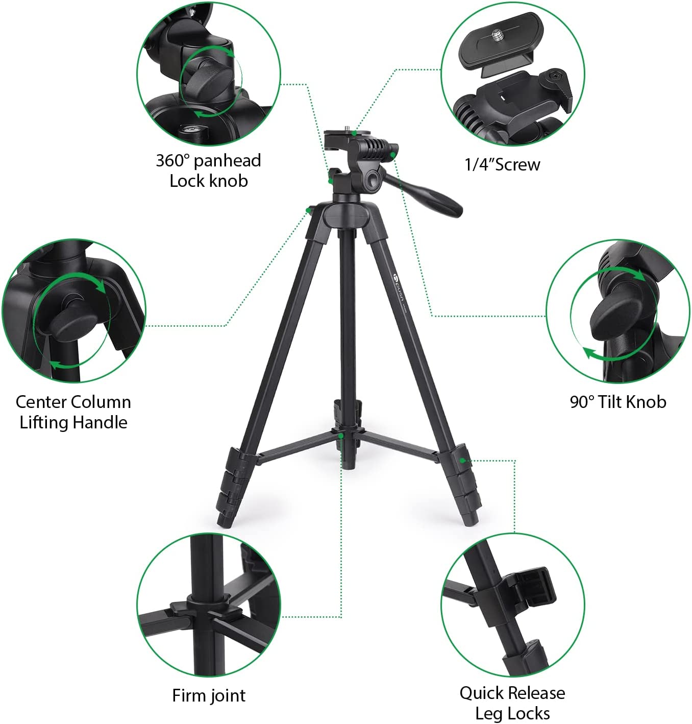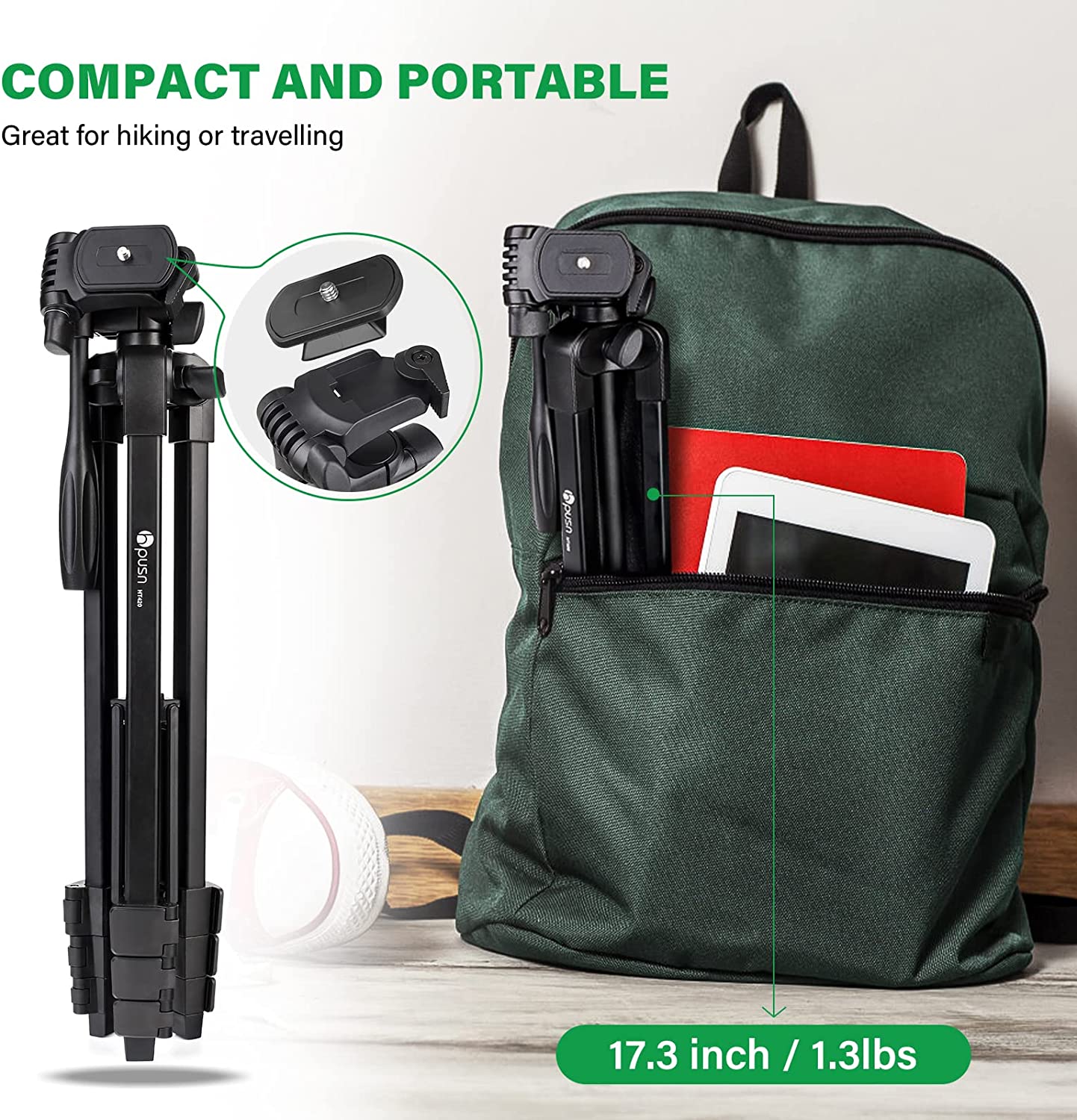• 【COMPACT & LIGHTWEIGHT】The weight is only 1.3 pounds, and the height ranges from 17 inches to 55 inches in a short period of time. The tripod can be folded to 17.3 inches short, can be put into a suitcase or backpack, plus a portable travel bag, suitable for lectures, classroom presentations, competitions, travel, blogs, selfies, portrait or landscape photography.
