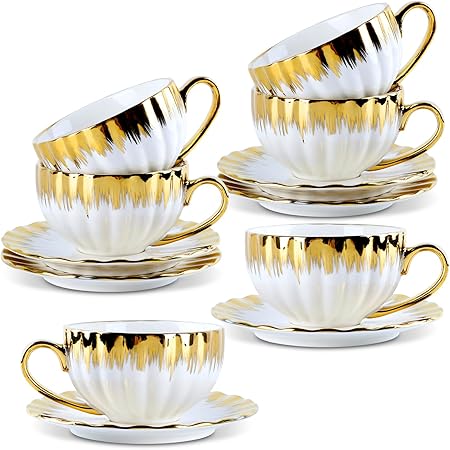 12pcs Turkish Coffee Cup Set, 8.5oz Cappuccino Cups and Saucers Set, Porcelain Tea Cup Set with Gold Trim, Tea Gift Set for Women Tea Party, Ceramic Tea Set for Espresso, Latte, Milk