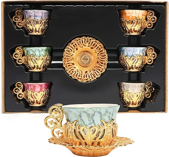 Alisveristime 12 Pc Turkish Greek Arabic Coffee Espresso Cup Saucer Porcelain Set (Gold)