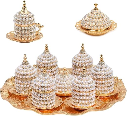 Alisveristime 27 Pc Ottoman Turkish Greek Arabic Coffee Espresso Serving Set with Pearl Embellishments, Saucer and Sugar Dish (Gold)