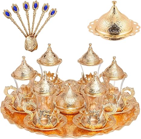 Alisveristime Handmade Turkish Tea Water Zamzam Serving Set Glasses Saucer, Tray and Spoon (Gold)