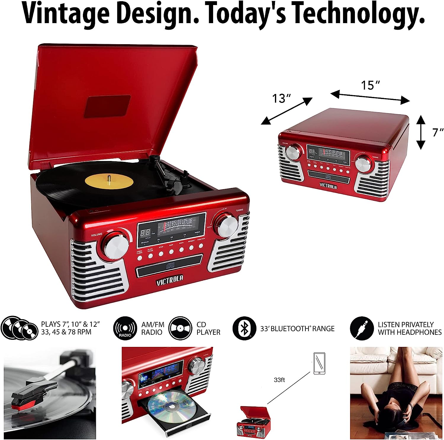 The Victrola 50s retro style record player takes you back in time - with its trendsetting retro looks combined with modern technology. Perfect for vinyl lovers, the 50's Retro Turntable features a 3-speed phono, a CD Player, and an AM/FM radio. With built-in Bluetooth, you can now stream music from your tablet, smartphone or MP3 using Bluetooth. Plus, this stylish piece lets you record from vinyl to MP3 (Mac/PC software and USB cable included). That’s not all – with 3.5mm Auxiliary Input, USB port and Headphone jack, the turntable opens a world of music possibilities that were unimaginable in the earlier Vinyl days.