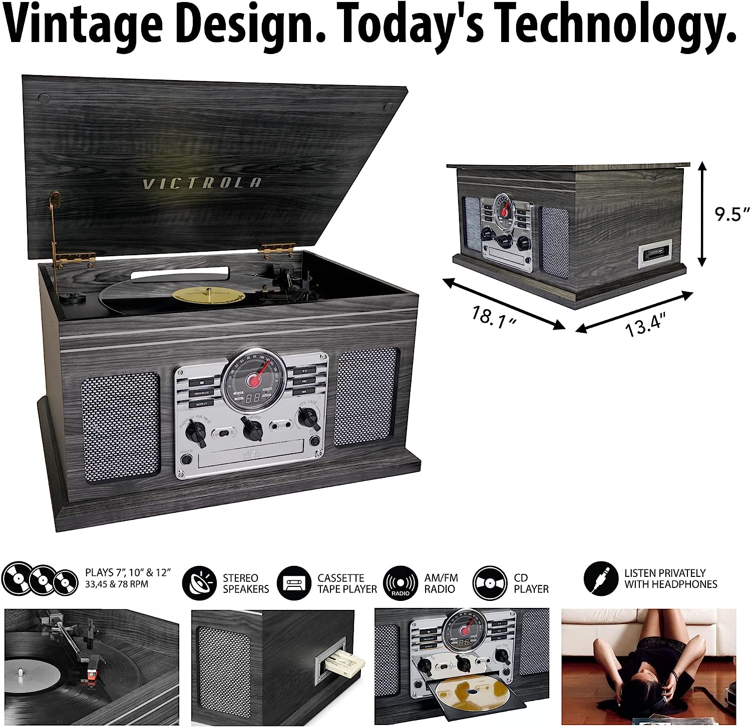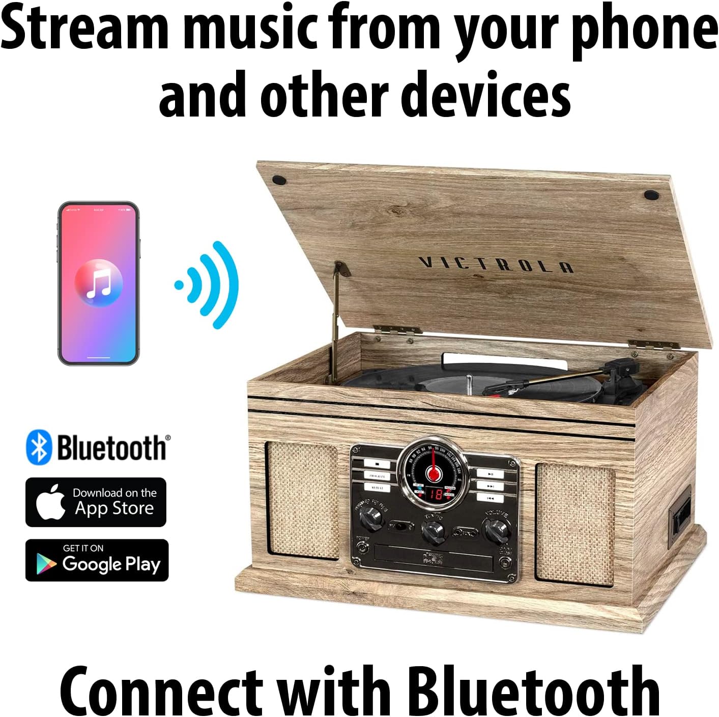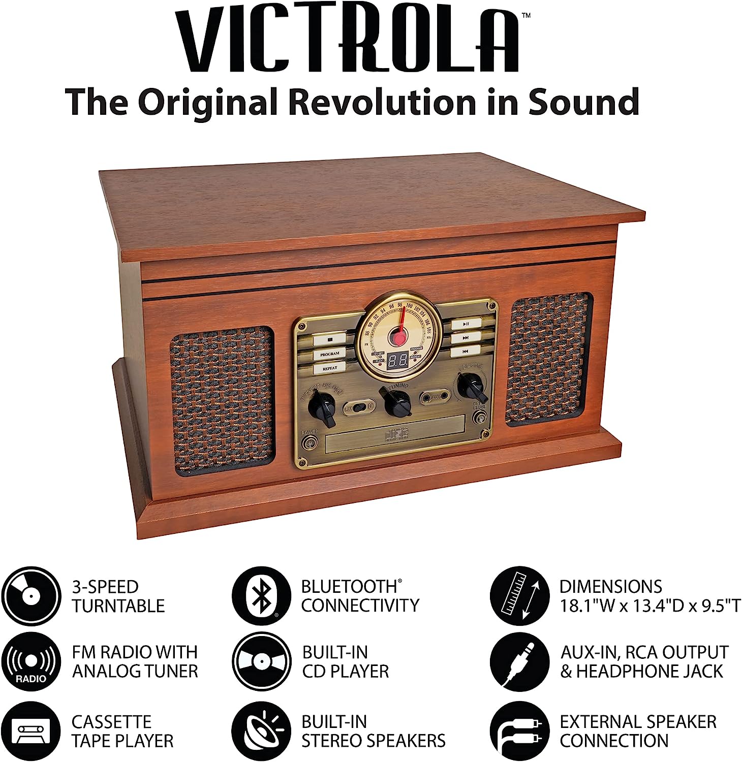 The Victrola Nostalgic 6-in-1 Solid Wood Record Player and Multimedia Player is a perfect blend of modern technology and nostalgic design. Perfect for vinyl lovers, the Classic Nostalgic Turntable features a 3-speed phono, a CD Player, a cassette tape player, and a FM radio. With built-in Bluetooth, you can now stream music from your tablet, smartphone or MP3 using Bluetooth. That’s not all – with 3.5mm Auxiliary Input, USB port and Headphone jack, the turntable opens a world of music possibilities that were unimaginable in the earlier Vinyl days. This stylish retro turntable designed with real wood construction and smart front paneling is a great conversation piece!