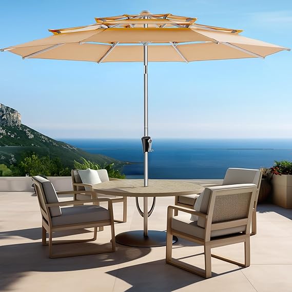 9ft Aluminum Patio Umbrella - 3 Tiers Vented Outdoor Commercial Market Table Umbrella, Heavy Duty Wind Proof Deck Pool Umbrella UPF50+ UV Protection 5-Year Fade Resistant (Beige)