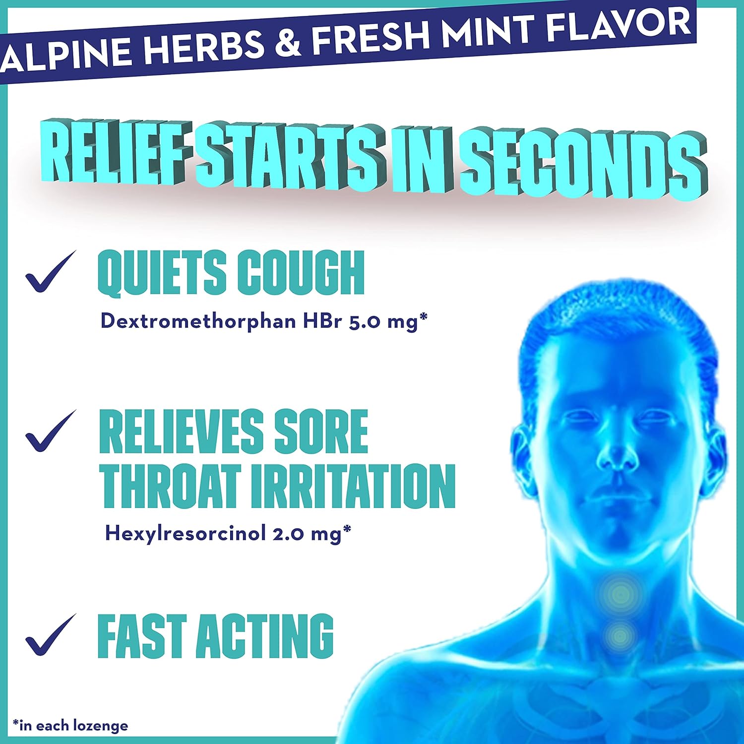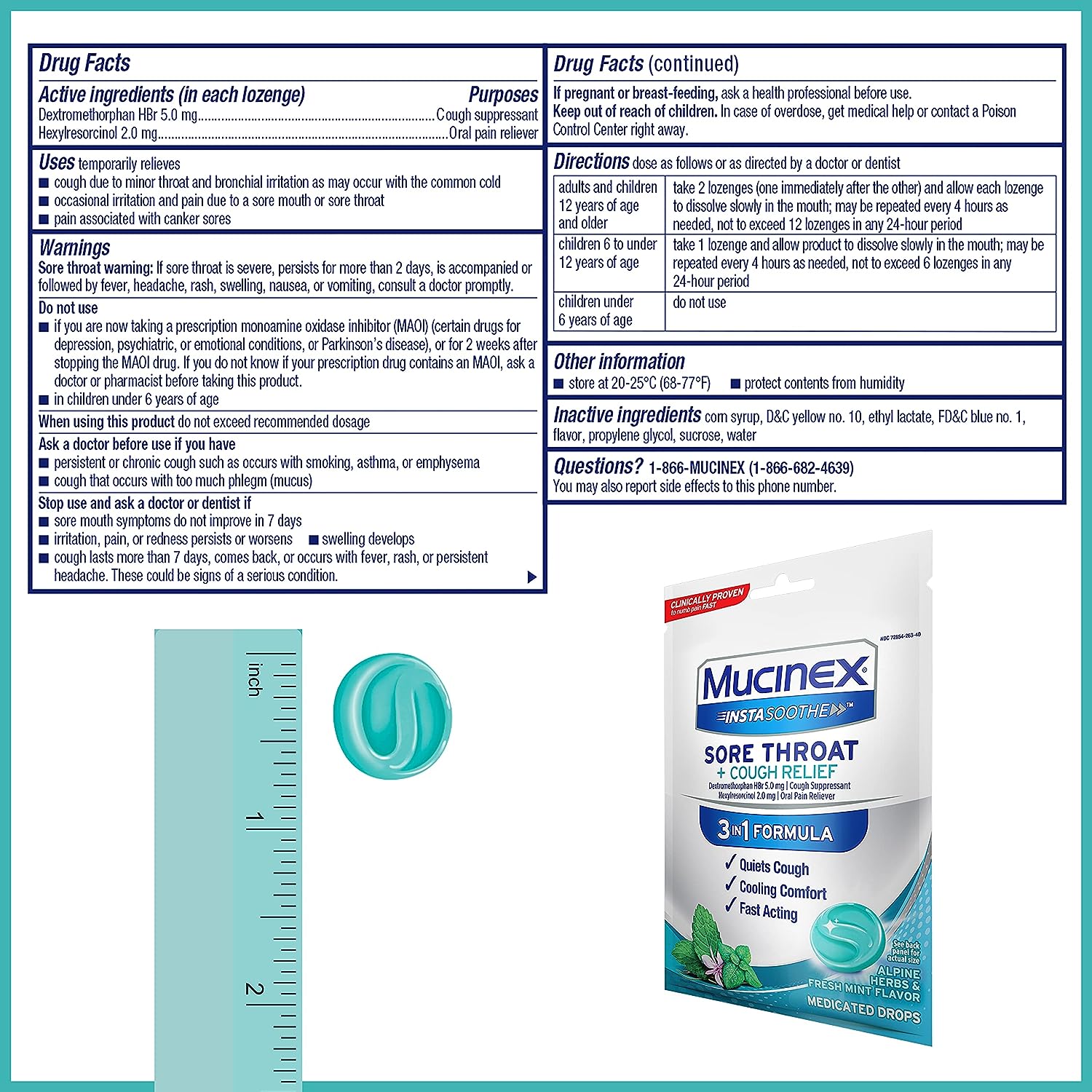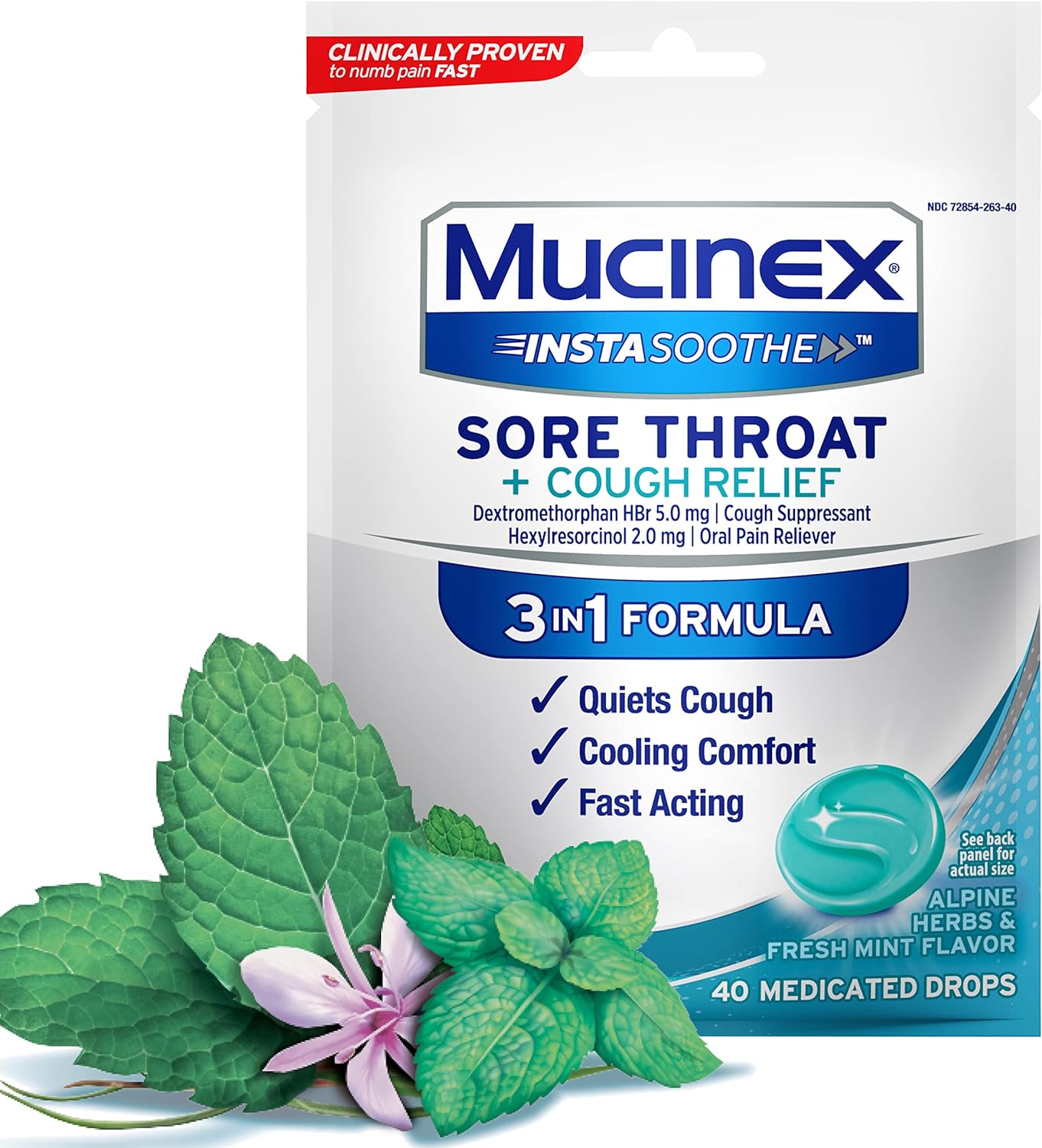 Introducing Mucinex InstaSoothe Sore Throat + Cough Relief Alpine Herbs & Mint Flavor Medicated Drops! Show your sore throat who's boss with our 3-in-1 formula that is Clinically Proven To Numb Pain Fast and quiet your cough so you can get back to your day. Each medicated drop contains Dextromethorphan HBr (5 mg) & Hexylresorcinol (2 mg). Temporarily relieves: Cough due to minor throat & bronchial irritation as may occur with the common cold, Occasional irritation & pain due to a sore mouth or sore throat and Pain associated with canker sores. This Powerful sore throat oral pain reliever starts to work in seconds & lasts for hours. FSA (Flexible Spending Account) and HSA (Health Savings Account) eligible. Save up to 30%. Cover out-of-pocket expenses with pre-tax dollars. Use as directed; Adults and children 12 years of age and over: Take 2 lozenges (1 immediately after the other) and allow each lozenge to dissolve slowly in the mouth; may be repeated every 4 hours as needed. Do not exceed 12 lozenges in any 24-hour period. Children 6 to under 12 years of age: Take 1 lozenge and allow product to dissolve slowly in the mouth; may be repeated every 4 hours as needed. Do not exceed 6 lozenges in any 24-hour period. Children under 6 years of age: Do not use.