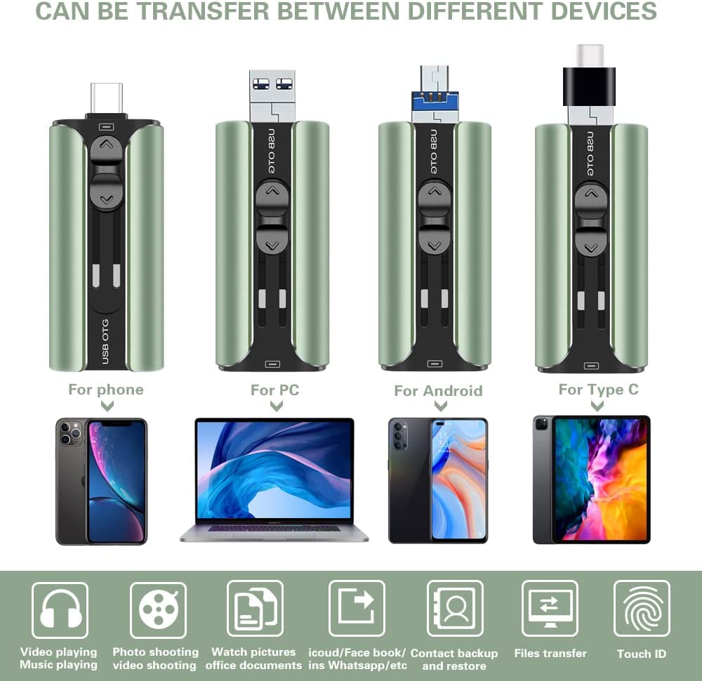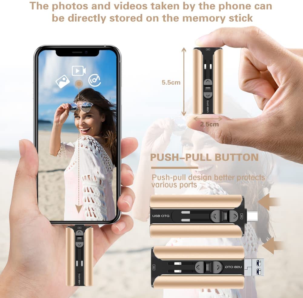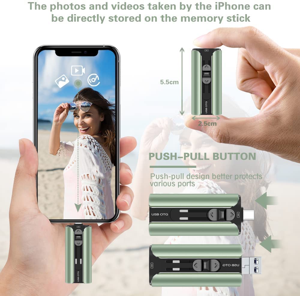 Multi-Interface Design: TRYVAT photo stick comes with iPhone port/USB A/Micro USB/Type C (independent adapter), compatible with iPhone/iPad/Android/PC and other devices with standard USB ports, can transfer data between various devices, easily complete data sharing.
