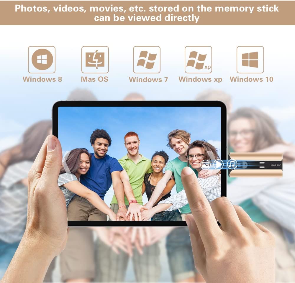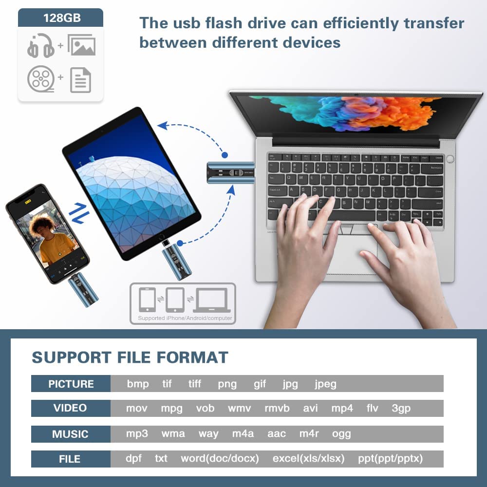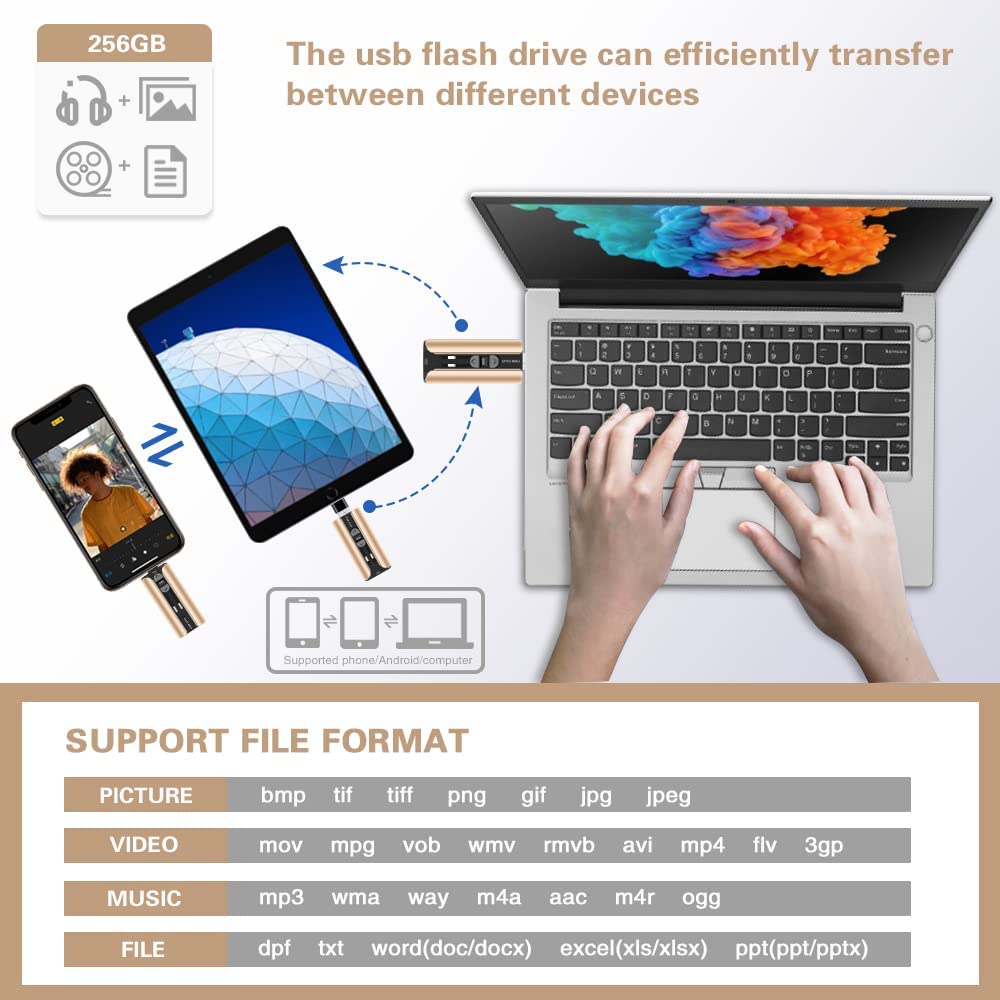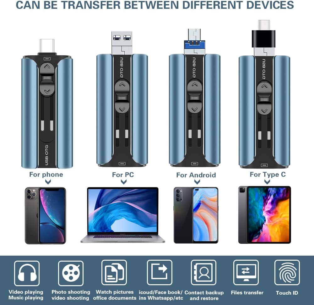 Multi-Interface Design: TRYVAT photo stick comes with iPhone port/USB A/Micro USB/Type C (independent adapter), compatible with iPhone/iPad/Android/PC and other devices with standard USB ports, can transfer data between various devices, easily complete data sharing.